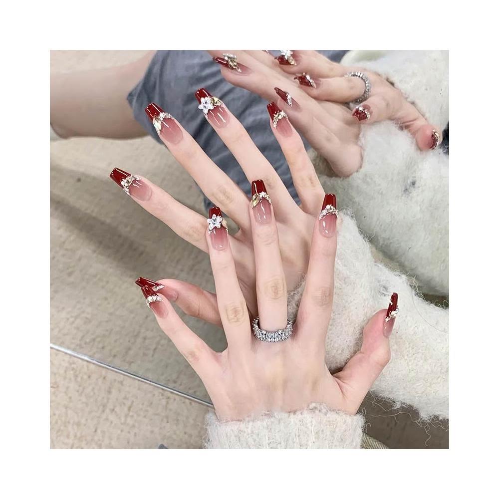 梵花 手工穿戴甲法式新年紅爆閃碎鑽高級感美甲中長梯顯白戰甲貼片指甲貼