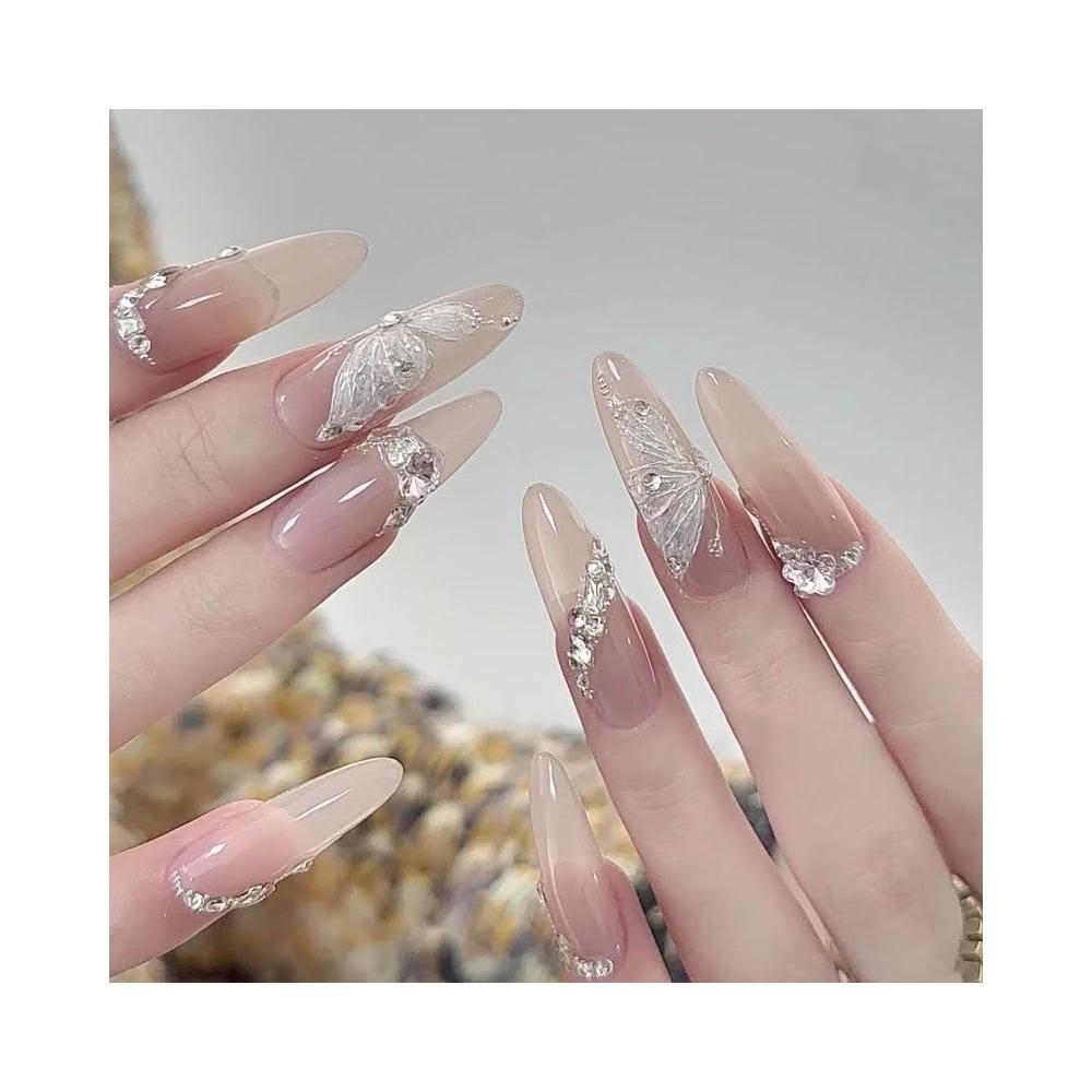 梵花 全新穿戴甲裸色奢華鑽手繪蝴蝶美甲貼片可拆純手工光療假指甲指甲貼