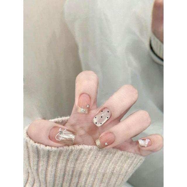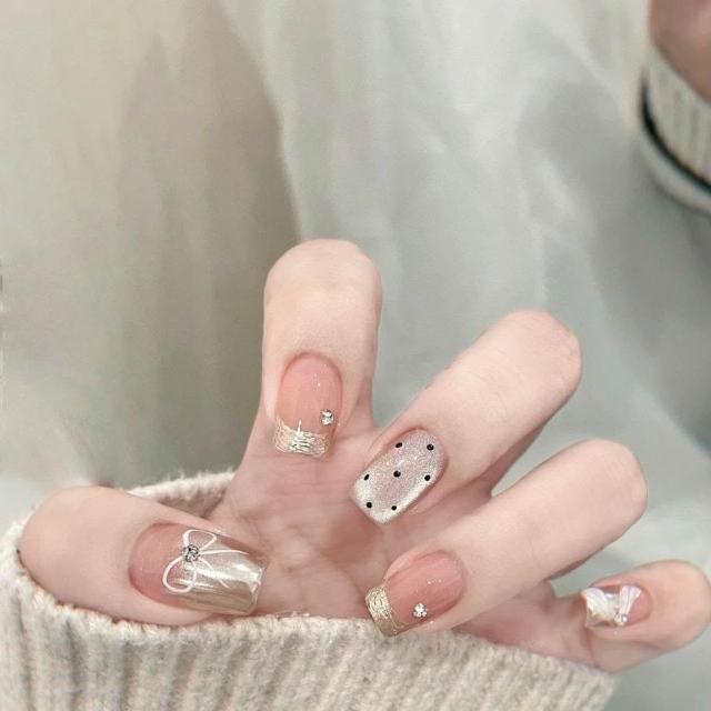 梵花 全新手工美甲穿戴甲短版法式貓眼波點高級ins甜美學生新娘指甲貼