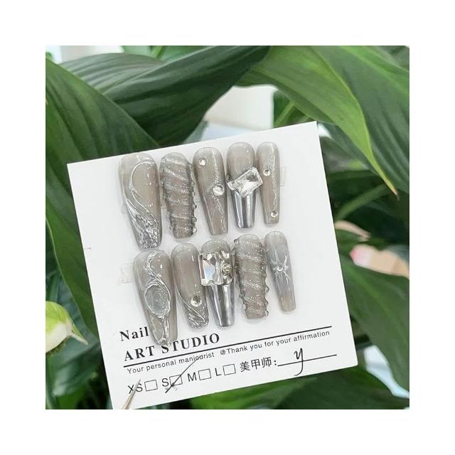 梵花 純手工穿戴甲2024千禧辣妹冰透銀色超長T型立體貓眼輕奢美甲貼指甲貼