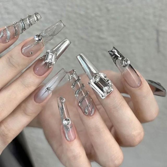 梵花 純手工穿戴甲2024千禧辣妹冰透銀色超長T型立體貓眼輕奢美甲貼指甲貼