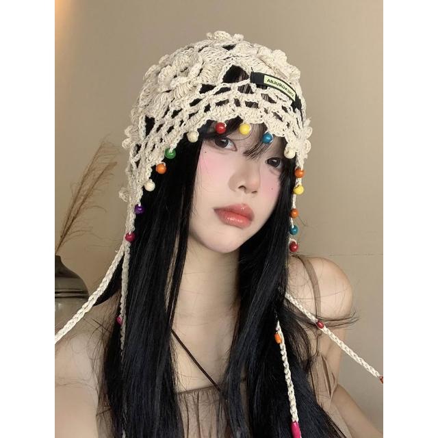 梵花 波希米亞花朵流蘇編織包頭帽女復古鏤空民族風套頭帽手工針織帽子
