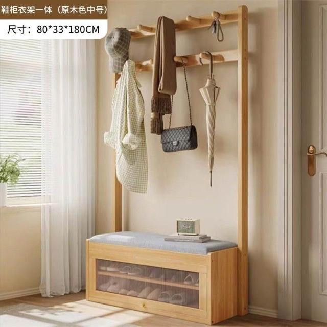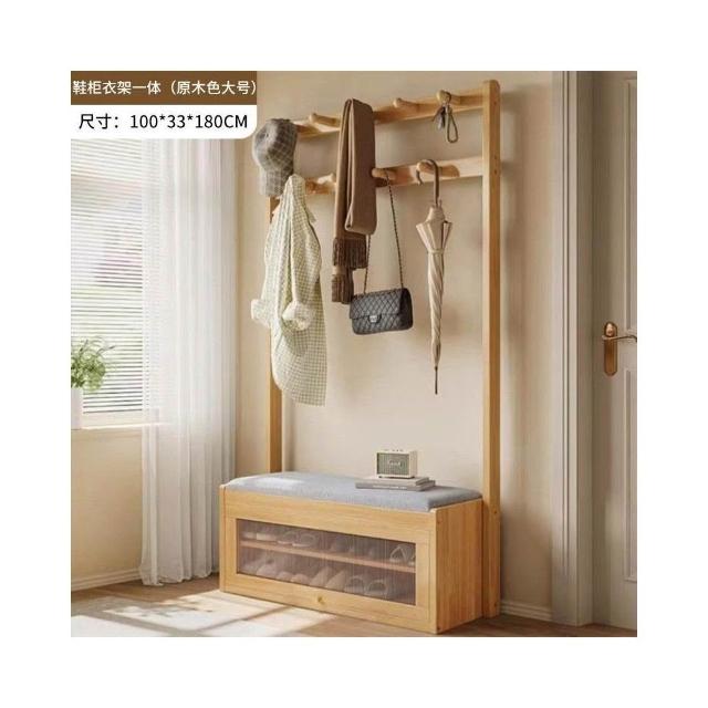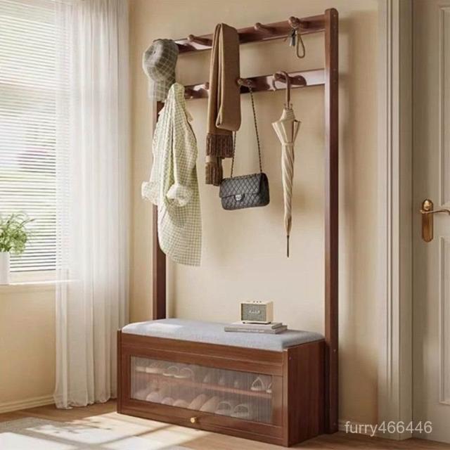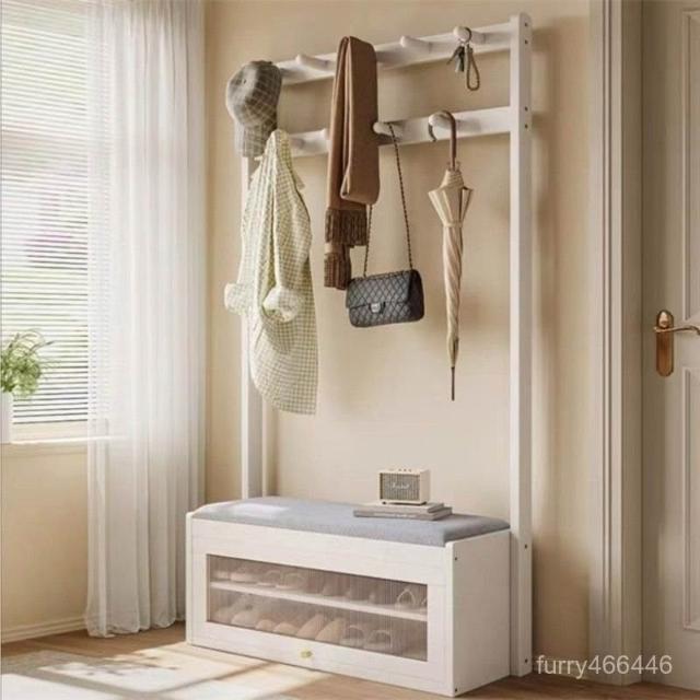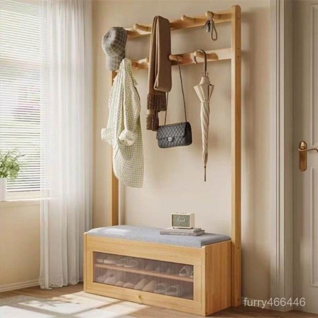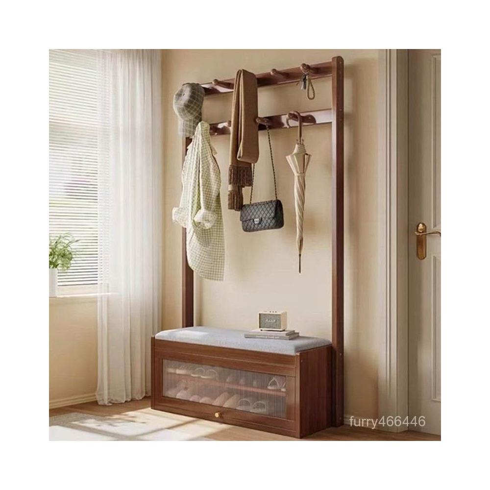 入戶門口換鞋凳掛衣架一體靠墻全實木置物架不佔地鞋櫃衣帽架落地