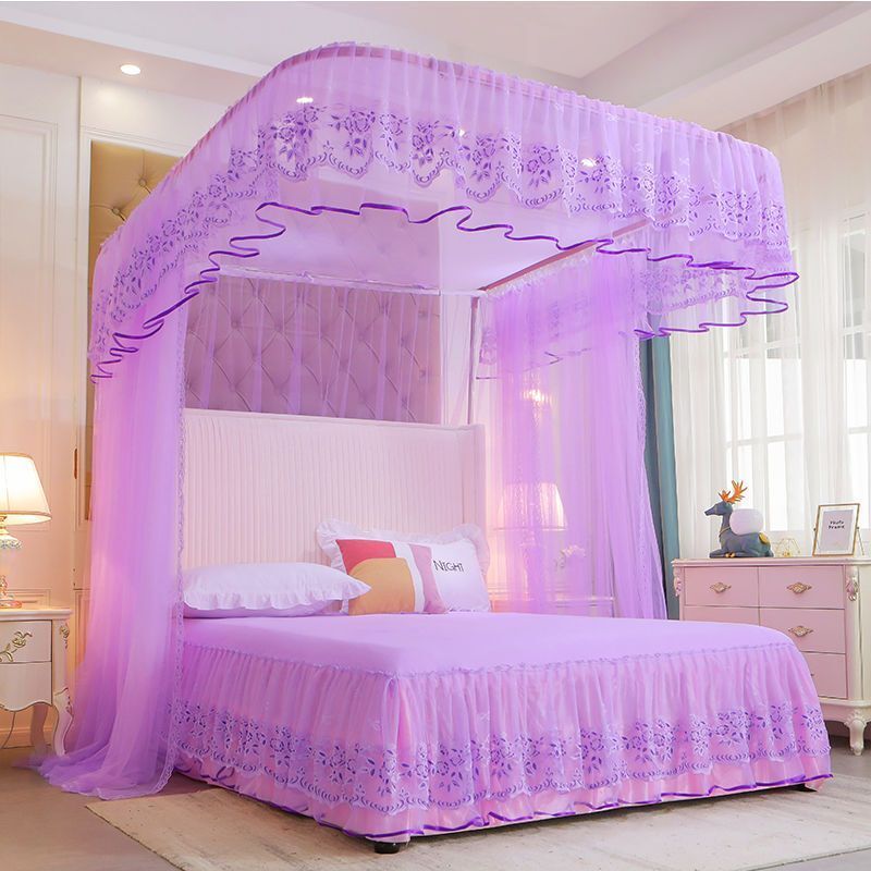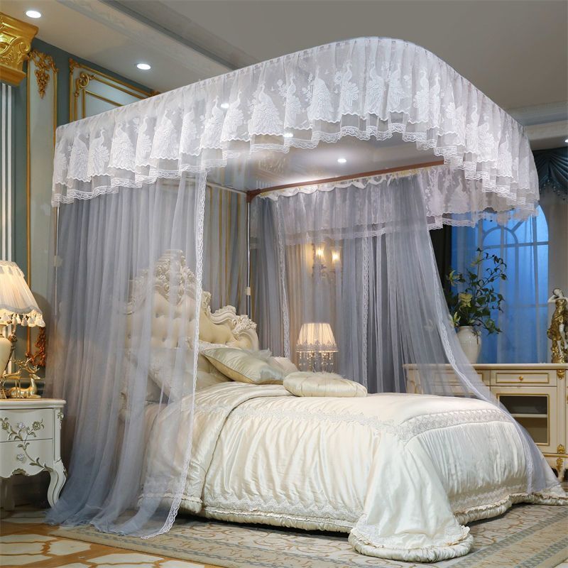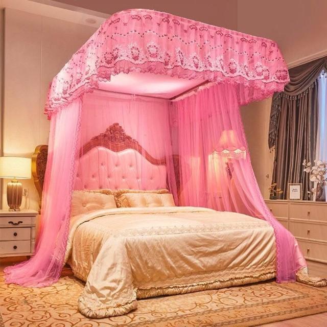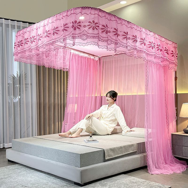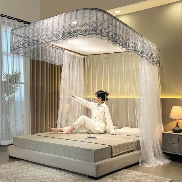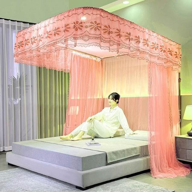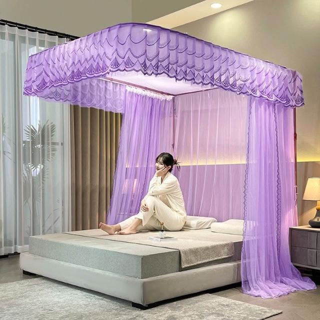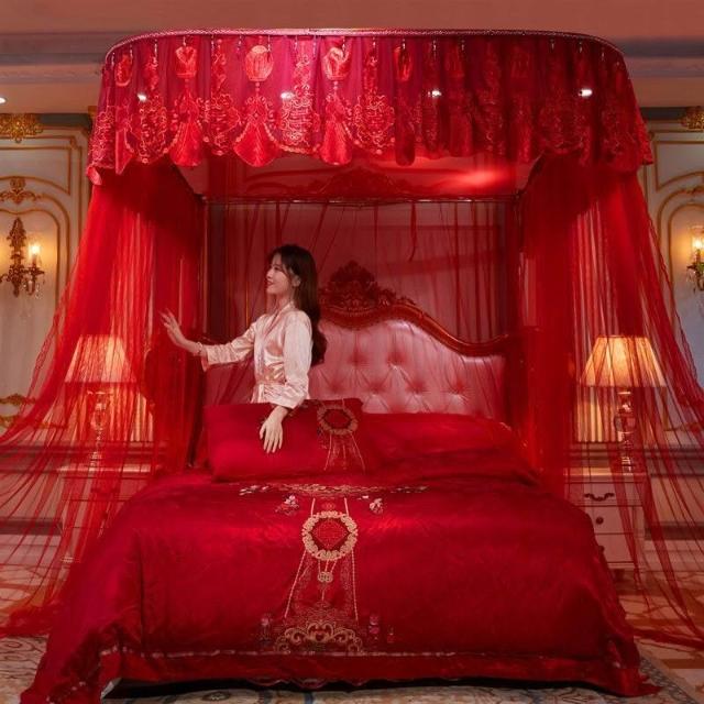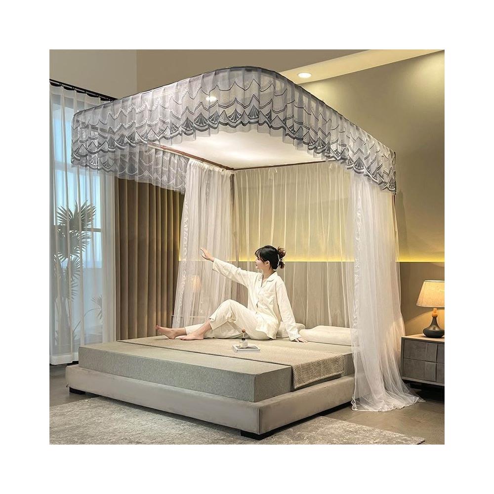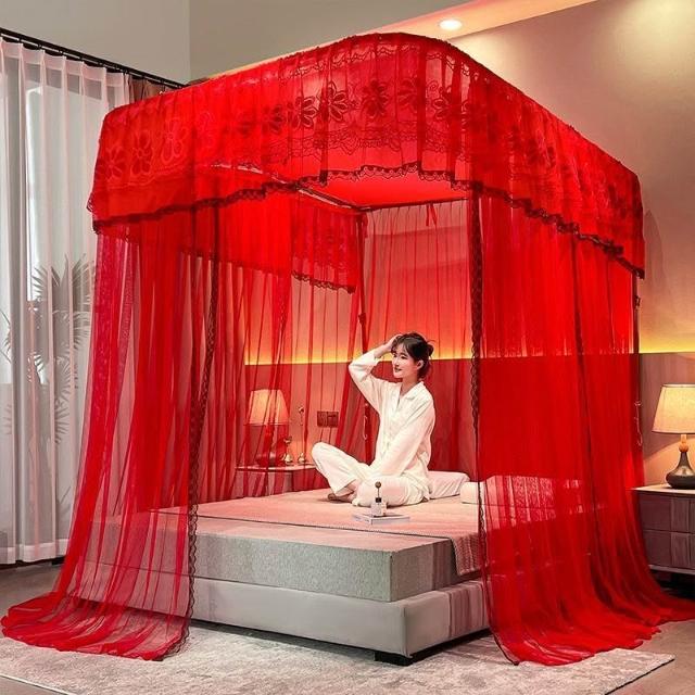 U型軌道蚊帳家用雙人導軌婚慶滑軌新款三開門加密伸縮公主風紋帳