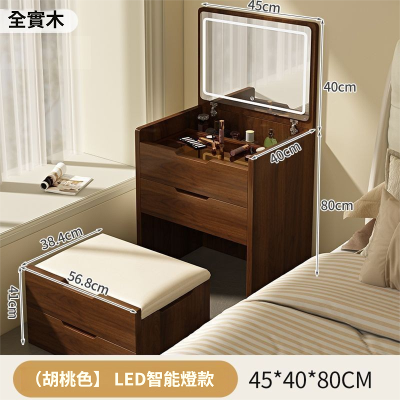 實木梳妝臺臥室床邊多功能帶燈化妝桌翻蓋出租房收納櫃一體床頭櫃