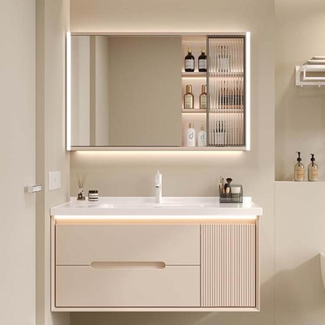 奶油風浴室櫃陶瓷一體盆衛生間洗手盆洗臉盆櫃組合洗手臺盆衛浴櫃