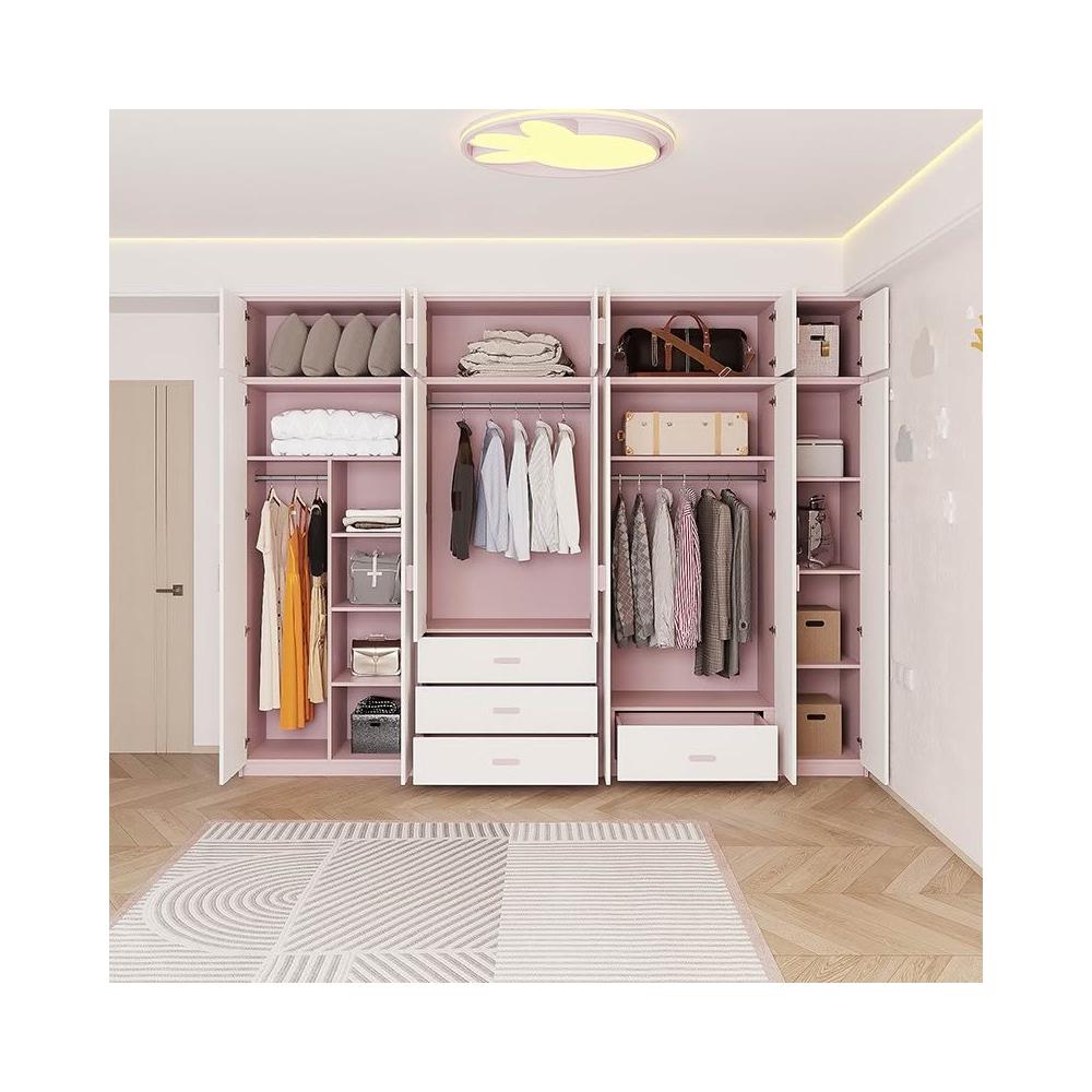 W*兒童房衣櫃臥室家用女孩粉色整牆到頂實木衣櫥收納櫃子平開門可