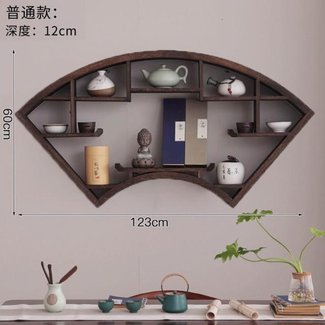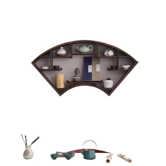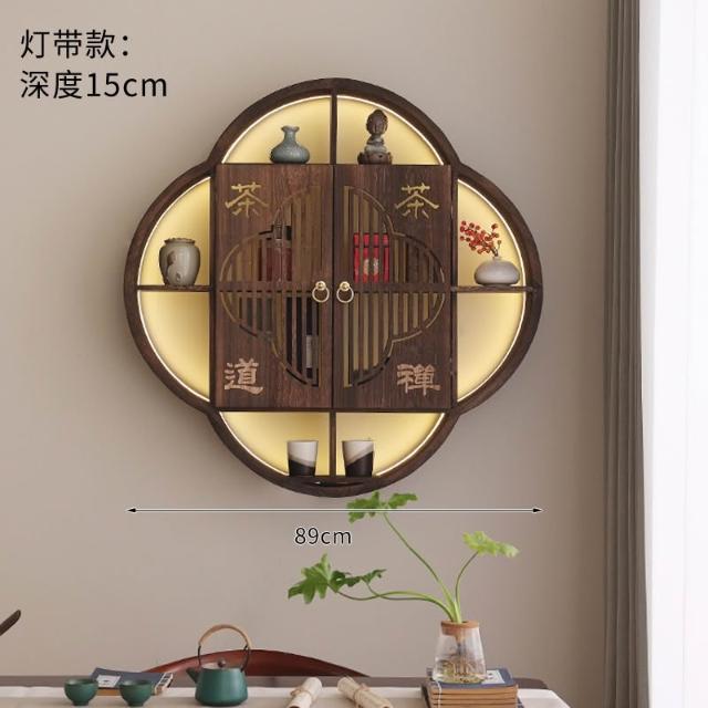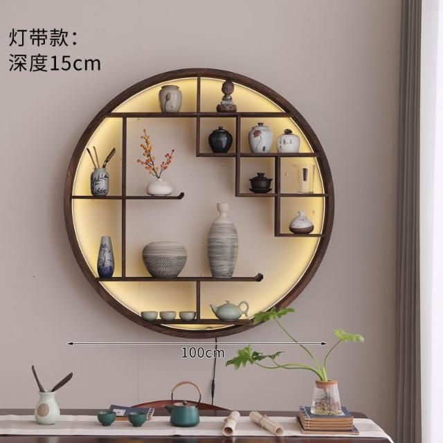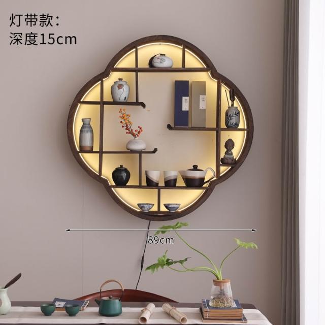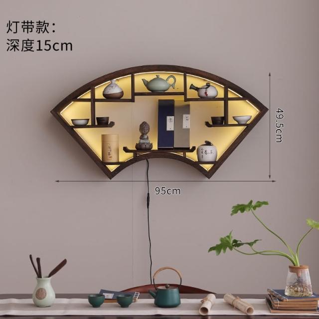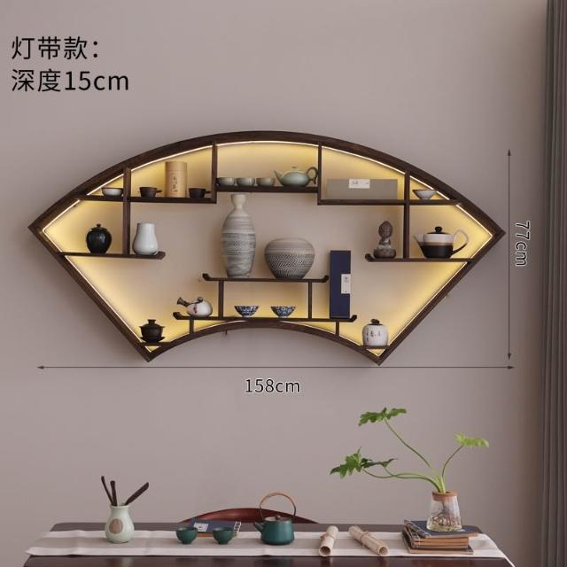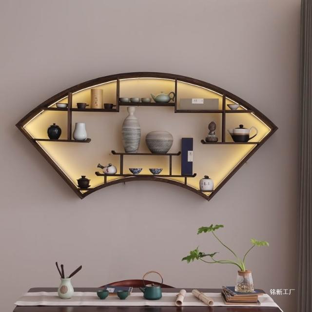 扇形燈帶博古架實木茶杯茶具收納多寶閣置物架中式復古格子壁掛式