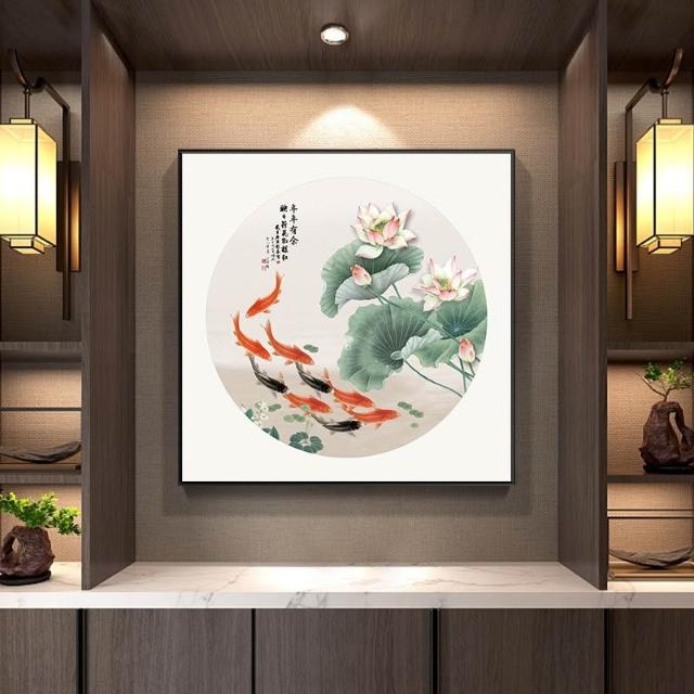 荷花九魚圖裝飾畫新中式飯廳餐廳牆面掛畫風水招財鯉年年有魚壁畫