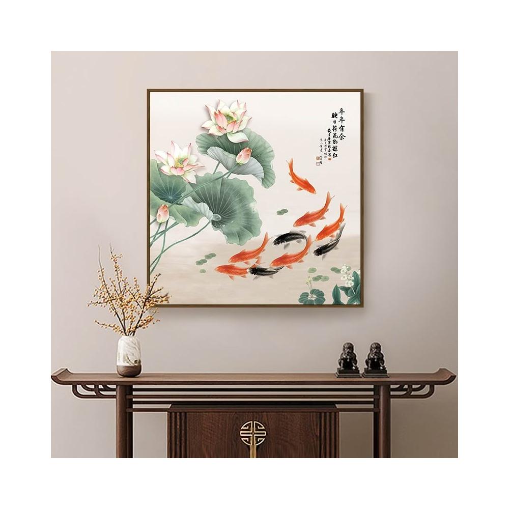 荷花九魚圖裝飾畫新中式飯廳餐廳牆面掛畫風水招財鯉年年有魚壁畫