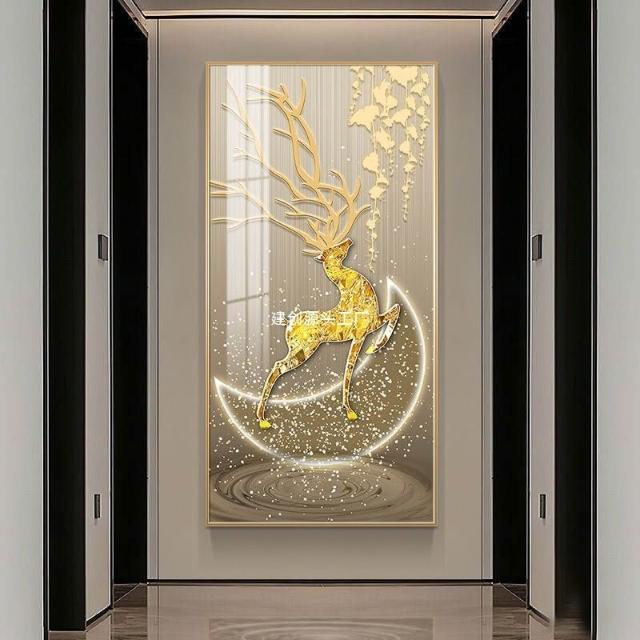 玄關裝飾畫輕奢簡約大氣豎版掛畫麋鹿進門玄關畫走廊過道裝飾壁畫