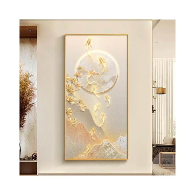 免運含稅 現代輕奢裝飾畫 入戶玄關裝飾畫 九魚圖掛畫 客廳走廊高級感掛畫 銀杏葉豎版壁畫