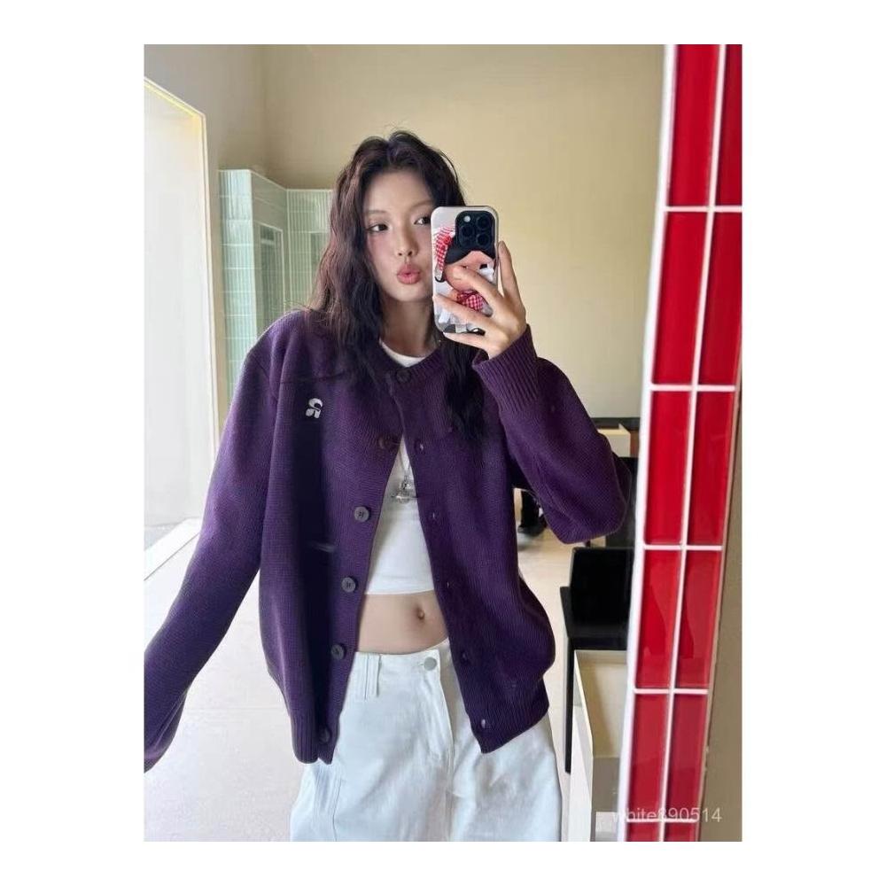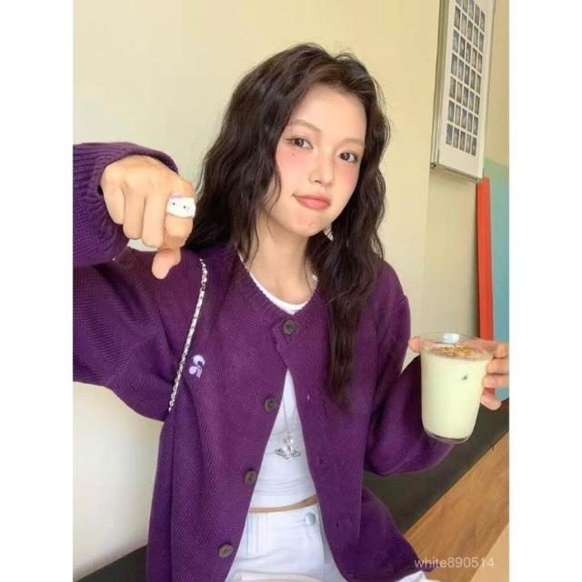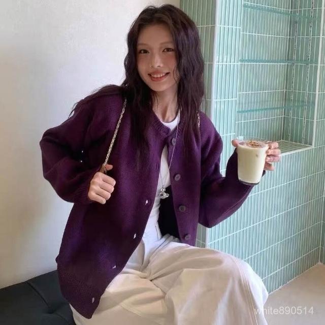 超顯白紫色毛衣開衫外套女秋季休閒寬鬆針織開衫上