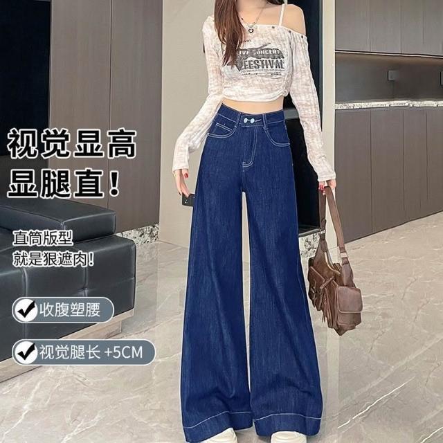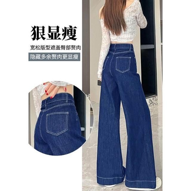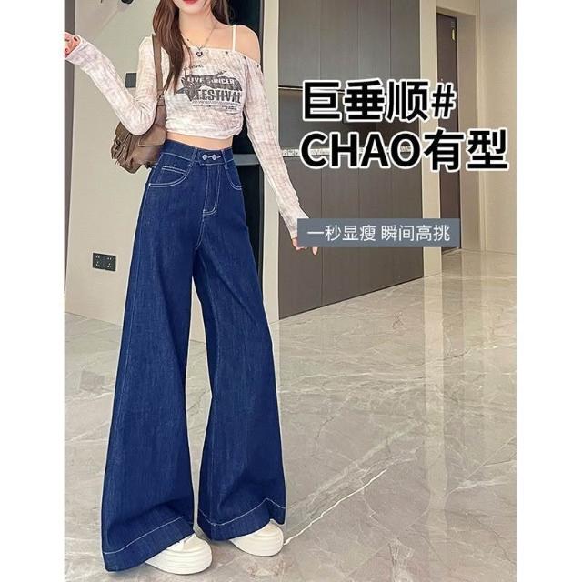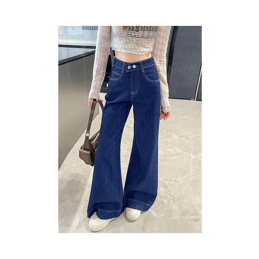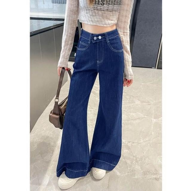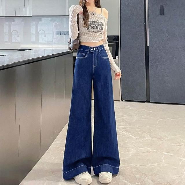 個性潮流ins風雙扣闊腿褲牛仔褲女 拖地褲 顯瘦牛仔褲 修