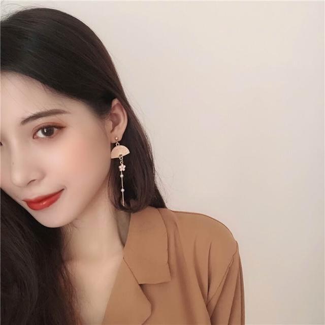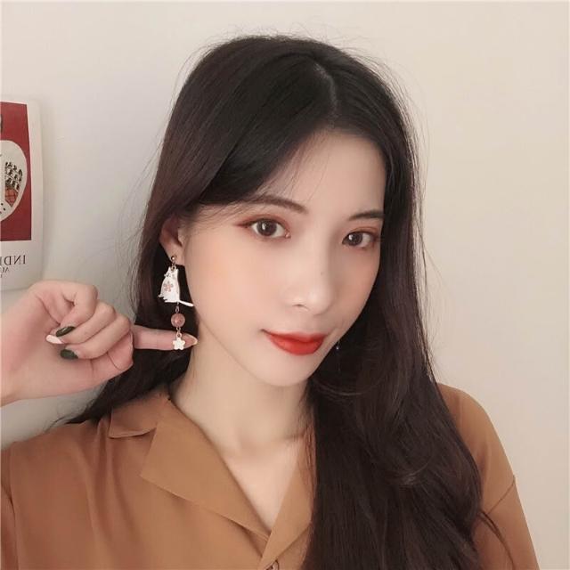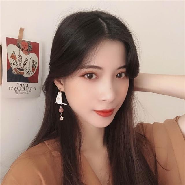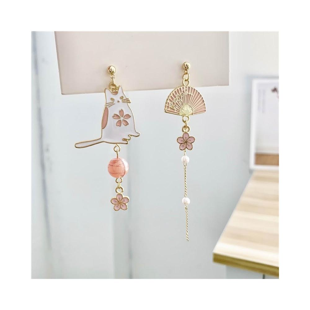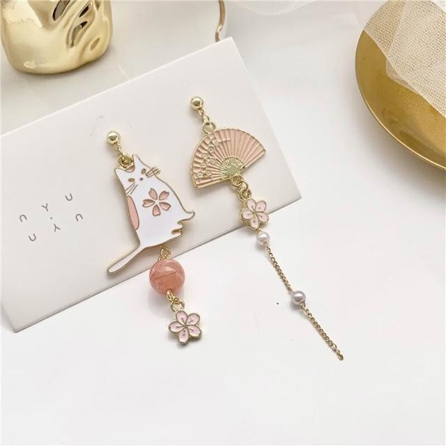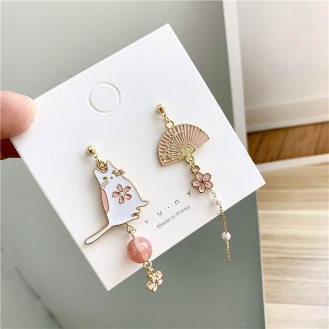 S925銀針日韓超仙貓咪扇子不對稱耳釘少女花朵流蘇耳環-C461