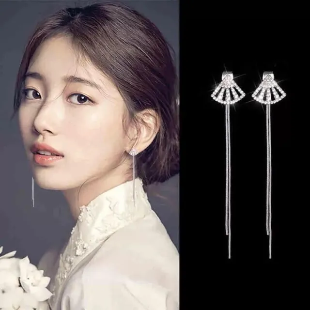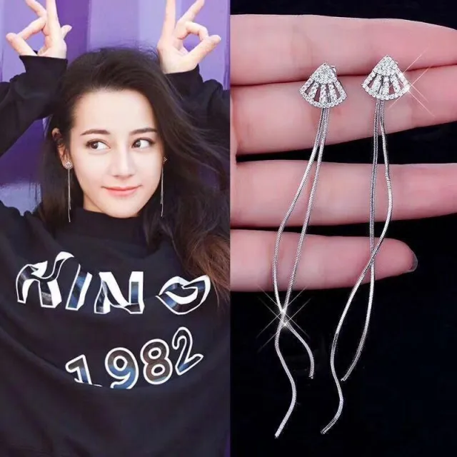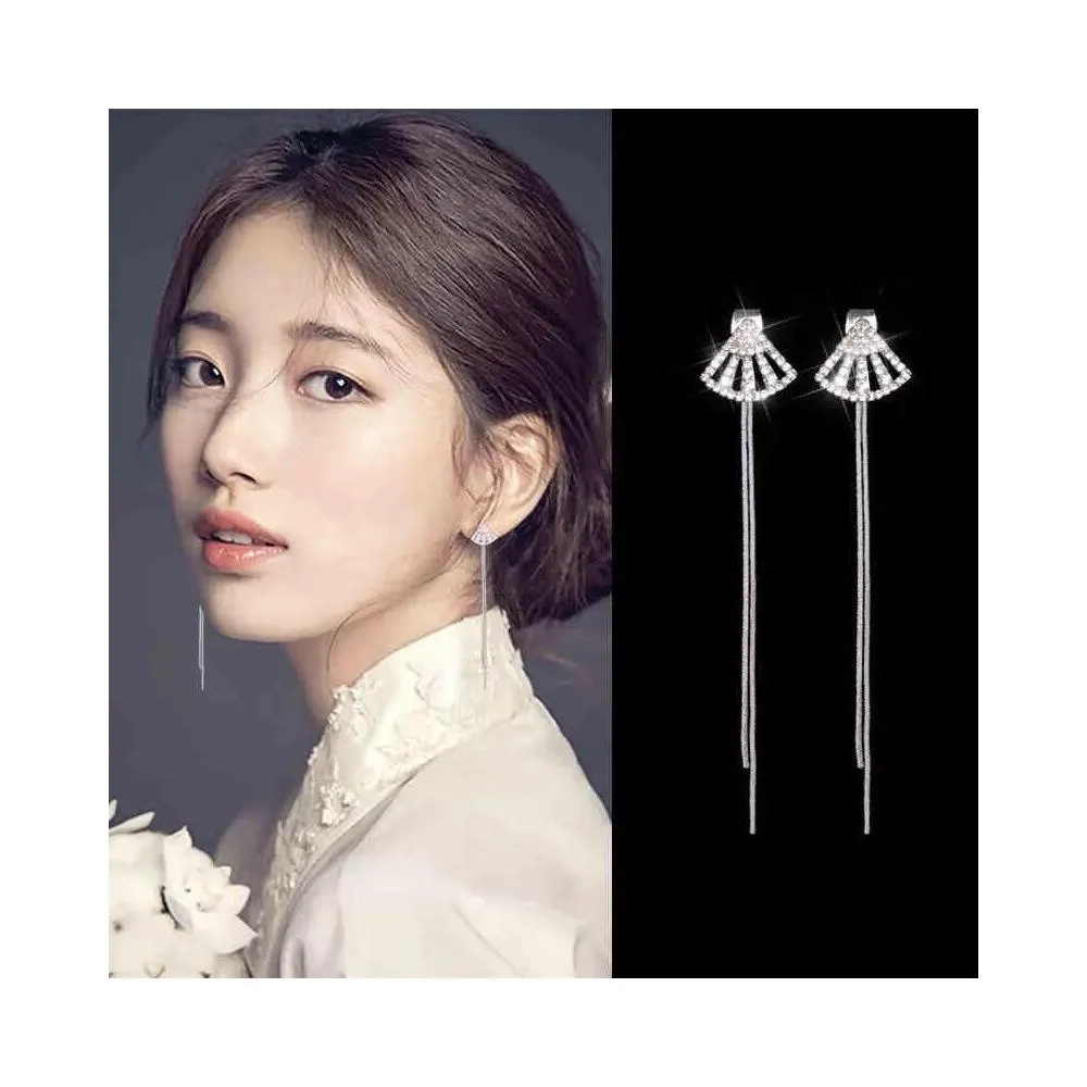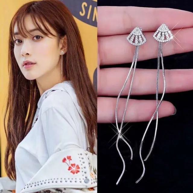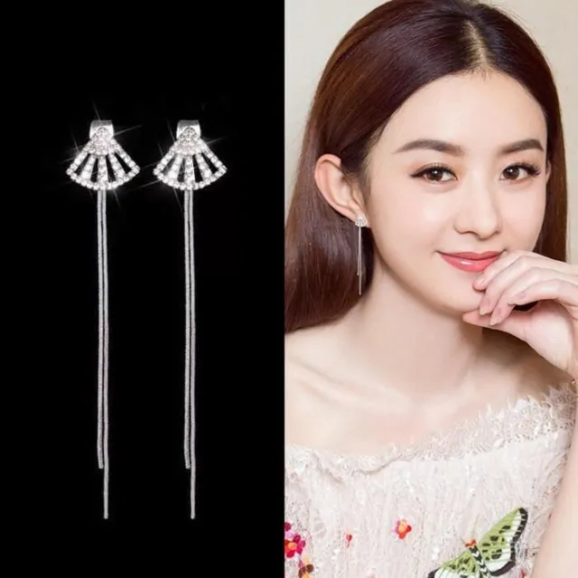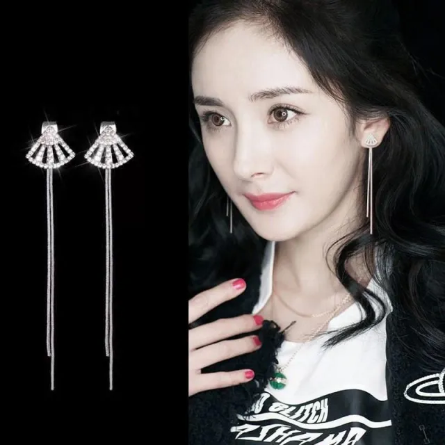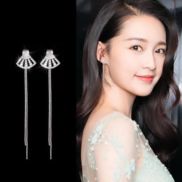 後掛式滿鑽扇子扇形銀針長款流蘇耳環耳飾-C82