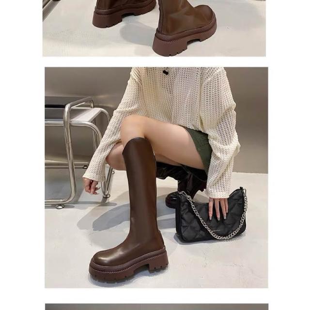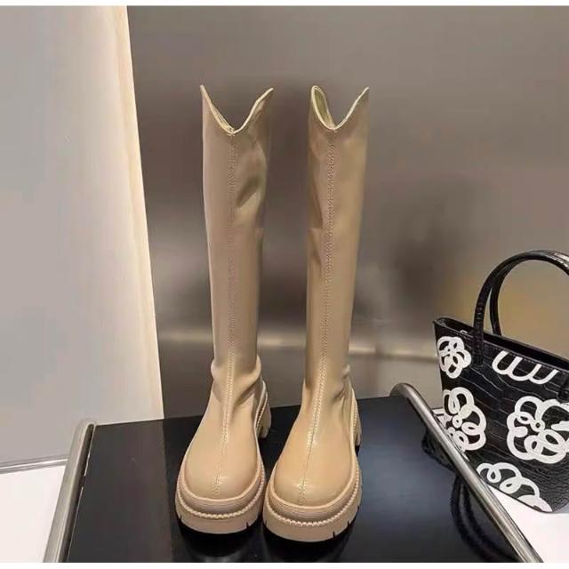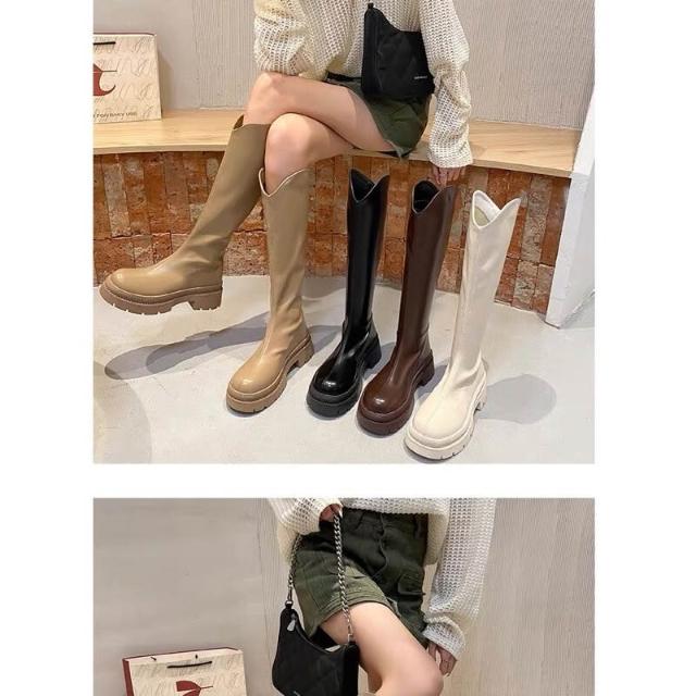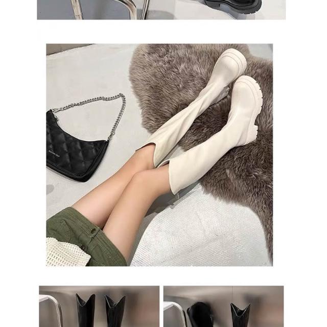 女鞋 厚底V口長靴白色中筒馬丁靴 高筒靴 長筒靴 騎
