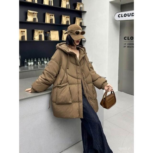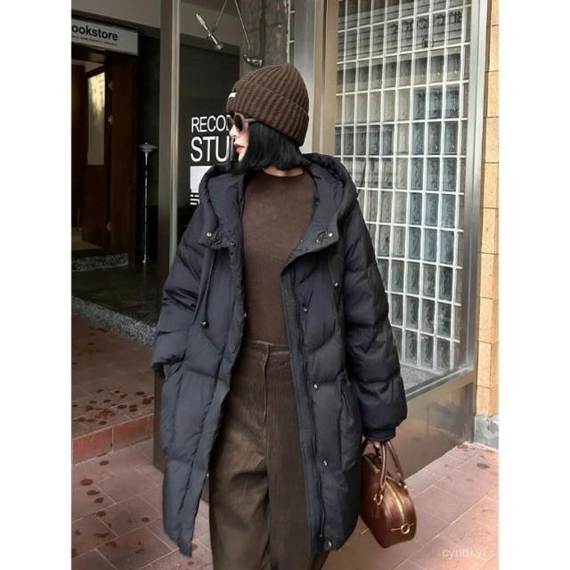 白鴨絨中長版外套女 新款女裝 口袋抽繩高檔時尚款連帽休閒羽絨服 寬鬆大版顯瘦版外 冬季外套 保暖防寒1008