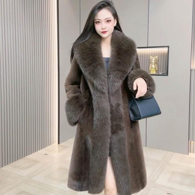 2024新款仿水貂毛皮毛一體大衣女仿狐貍毛領歐貂絨中長版海寧皮草 皮草外套女 毛毛外套 貂皮大衣 貂毛外套1205 JI
