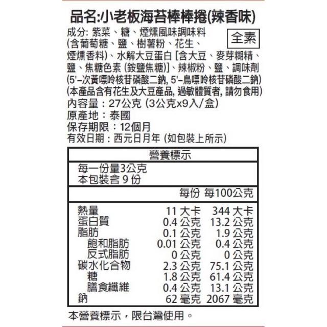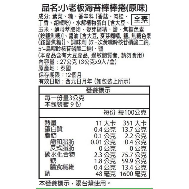 小老闆 海苔卷海苔捲盒裝原味/辣味/bbq 9條 共27g泰國