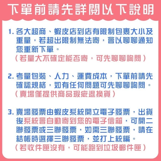- 針對大型商品(包括:大型家電、家具床墊、健身按摩器材、車類...等),商店將於完成收款確認後,一天內〈不含例假日〉將會有專人與您確認相關配送細節等的聯繫。偏遠地區、樓層費及其它加價費用,皆由商店於約定配送時一併告知,商店將保留出貨與否的權利。