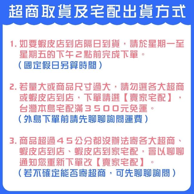 - 針對大型商品(包括:大型家電、家具床墊、健身按摩器材、車類...等),商店將於完成收款確認後,一天內〈不含例假日〉將會有專人與您確認相關配送細節等的聯繫。偏遠地區、樓層費及其它加價費用,皆由商店於約定配送時一併告知,商店將保留出貨與否的權利。