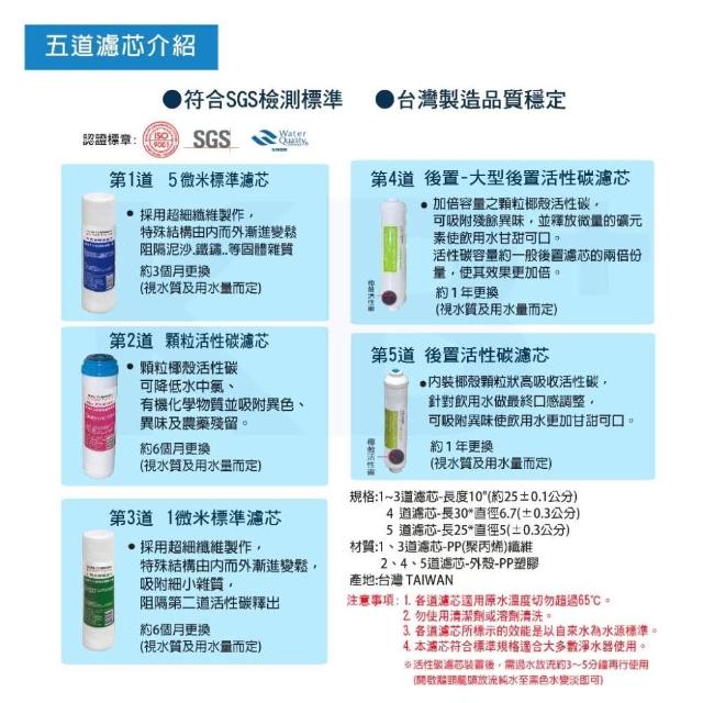 - 五道濾淨 雙後置活性碳強化設計