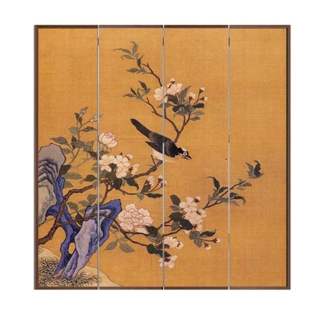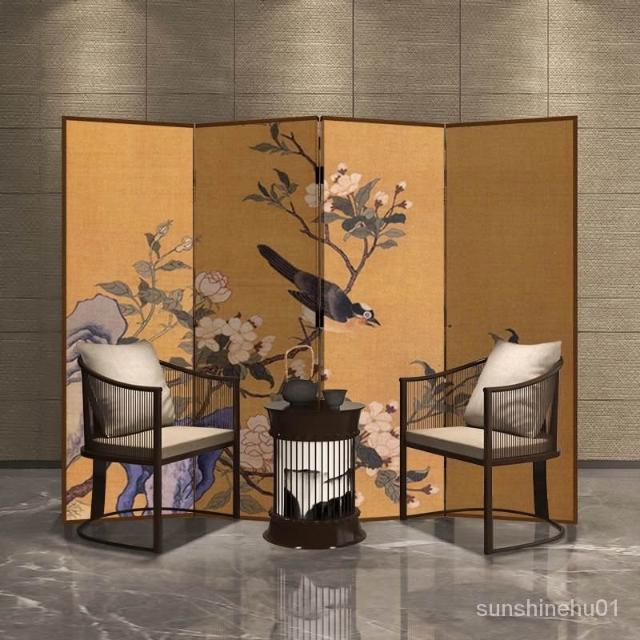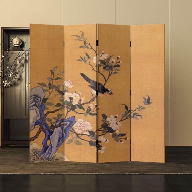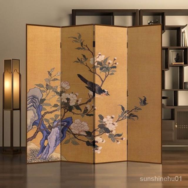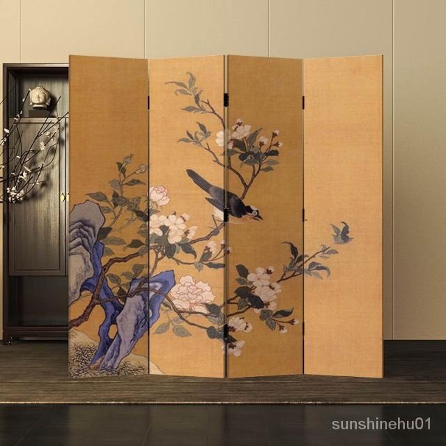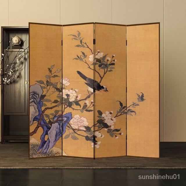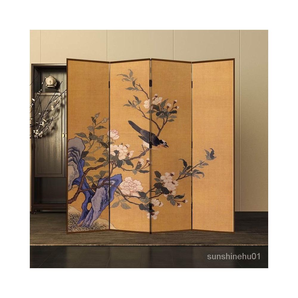 新中式中古屏風隔斷客廳玄關實木移動茶室背景墻定製折屏花鳥古畵
