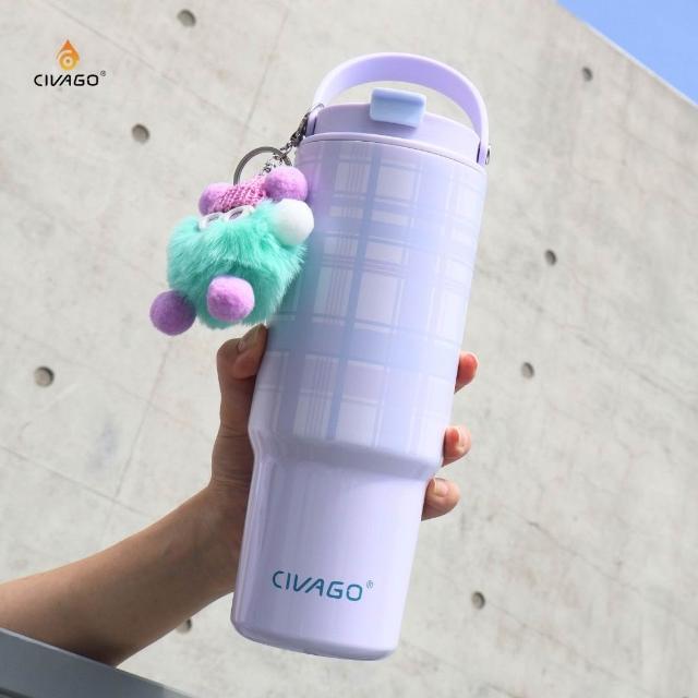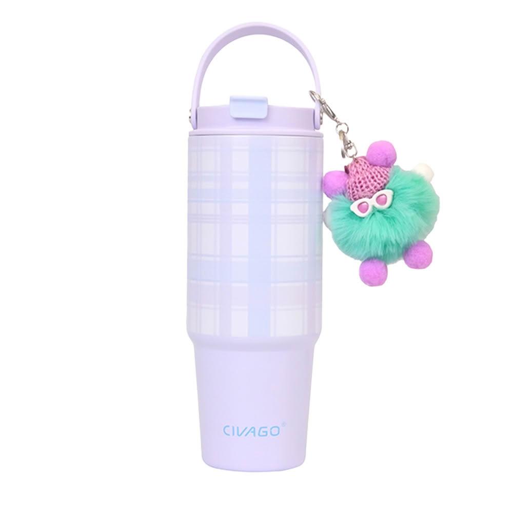 CIVAGO小怪獸雙飲保溫杯/薰衣奶紫格 850ml (隨杯附贈小吊飾)