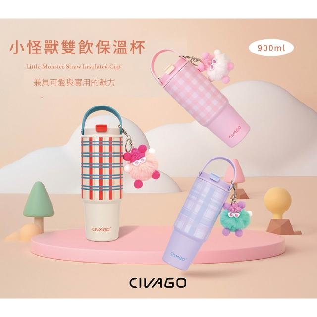 CIVAGO小怪獸雙飲保溫杯/薰衣奶紫格 850ml (隨杯附贈小吊飾)