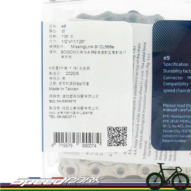 KMC e9 Turbo eBike系列 電動自行車鏈條9速(銀色)136目 附快扣 Eeyo 電動單車
