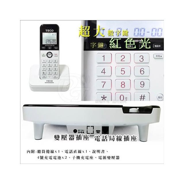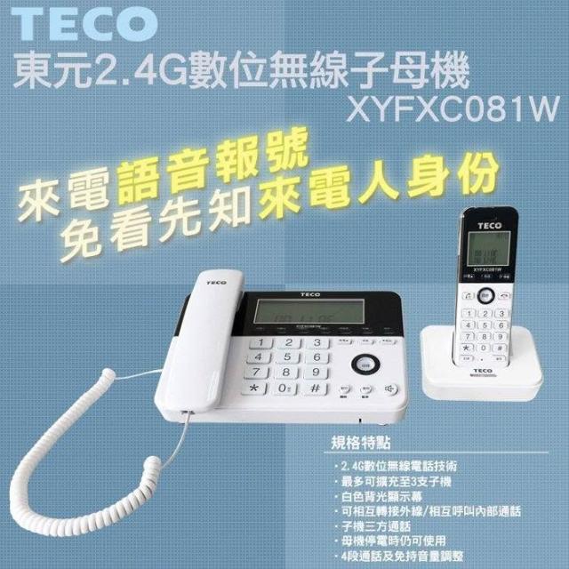 TECO 東元原廠保固〔家電王〕2.4G數位無線 子母機 XYFXC081W,報號 呼叫 轉接 親子機 無線電話 市內