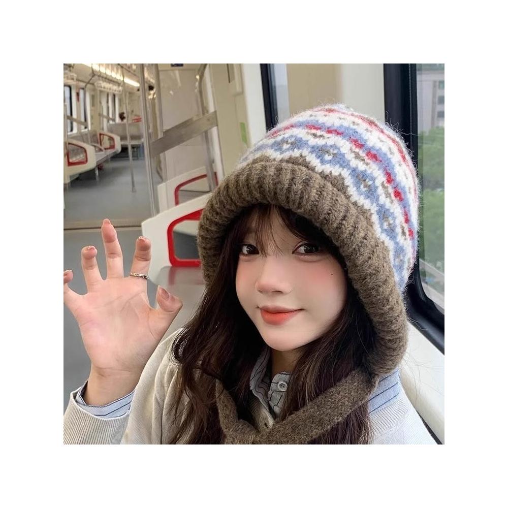 費爾島風針織帽女冬季巴拉克拉法帽子包包兩用保暖毛絨護耳毛線帽