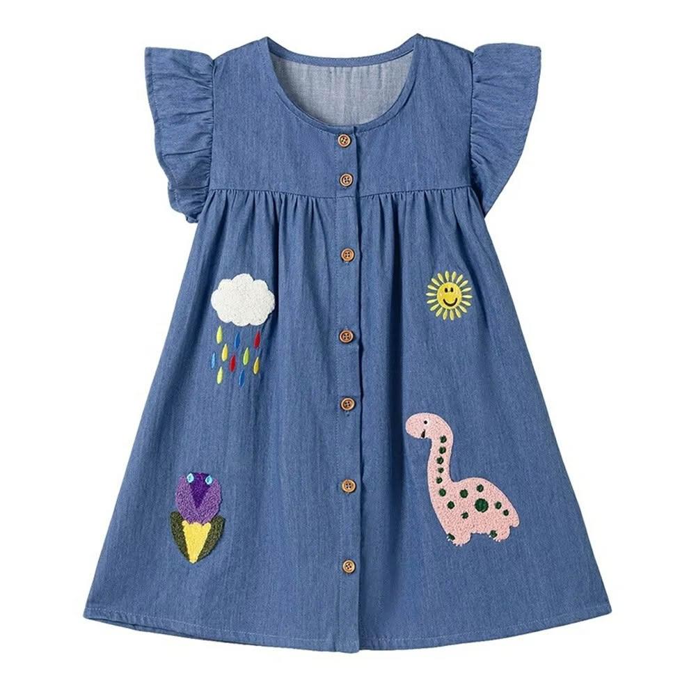 Baby 童衣女童軟牛仔裙 女孩卡通刺繡連身裙 夏季兒童可愛花邊袖牛仔洋裝 寶寶裙子 89101
