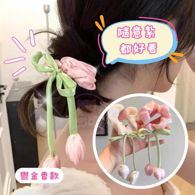 花朵髮圈【鬱金香丸子頭髮飾】髮圈 大腸圈 髮帶 髮飾 綁頭髮 包包頭 造型發圈 飄帶大腸髮圈 森系頭飾大腸髮圈