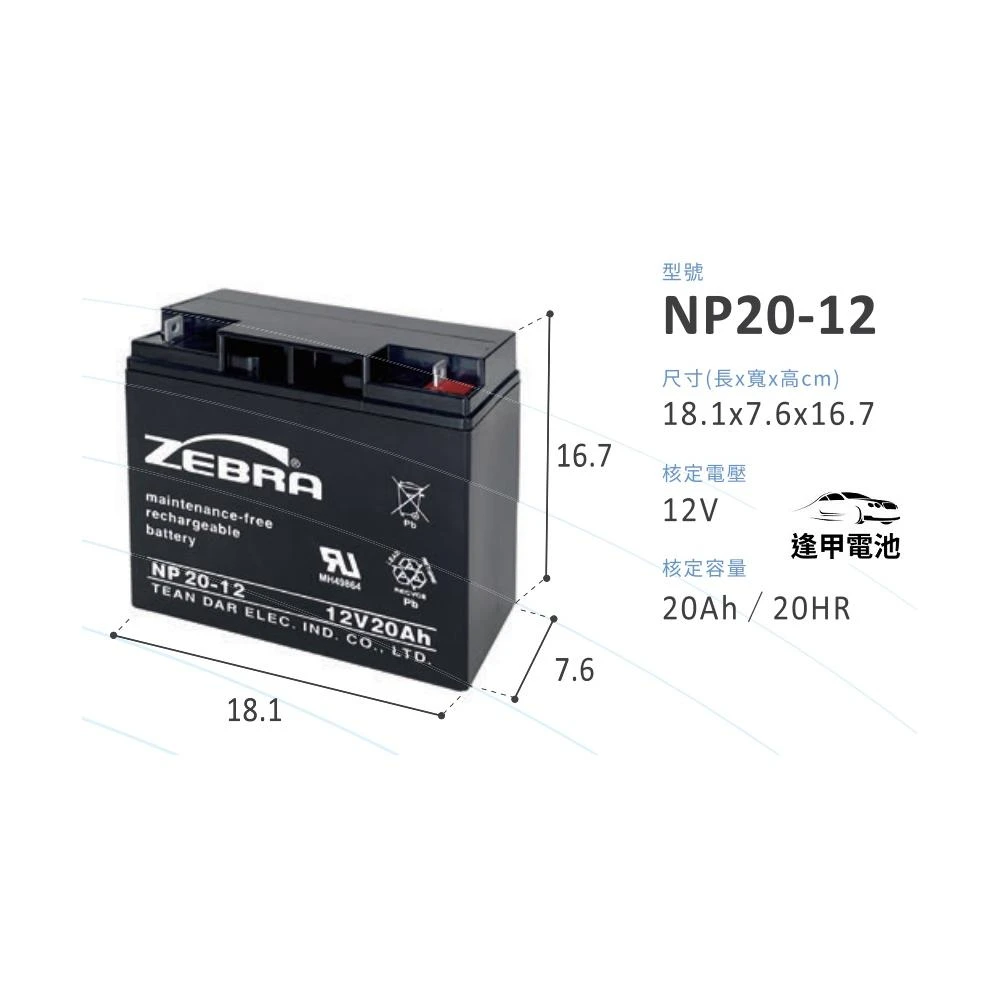 ZEBRA 斑馬牌救援電匠電池 NP20-12 12V20AH 同尺寸取代NP18-12 WP20-12