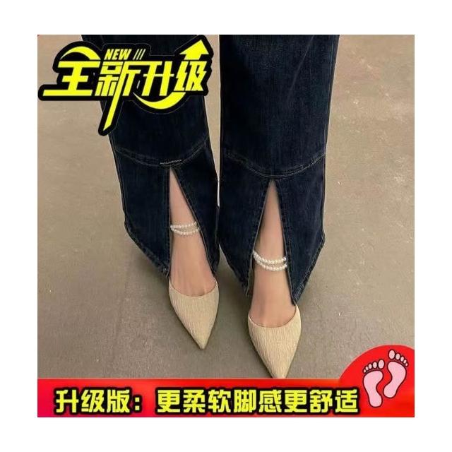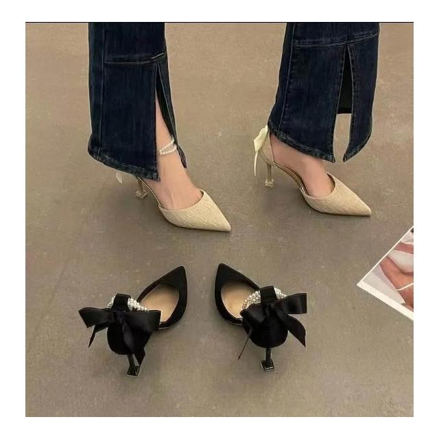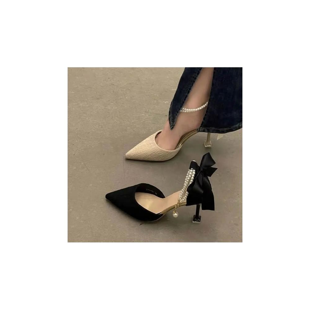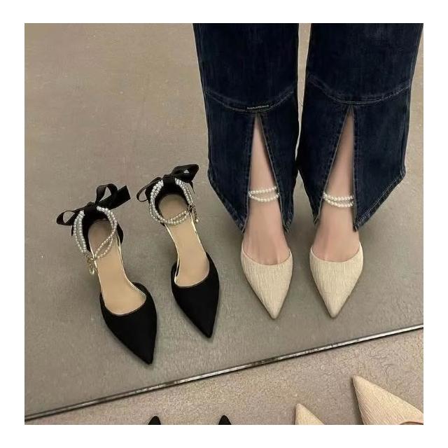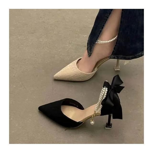 尖頭法式高跟鞋女細跟一字扣帶蝴蝶結珍珠氣質涼鞋成年禮單鞋