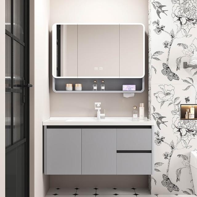 宅配免運 🍀新款一體式浴櫃🍀 衛生間浴室櫃 淺灰色圓弧浴櫃 加厚太空蜂窩鋁浴櫃 衛生間掛牆式浴櫃 洗手盆洗臉一體式浴櫃