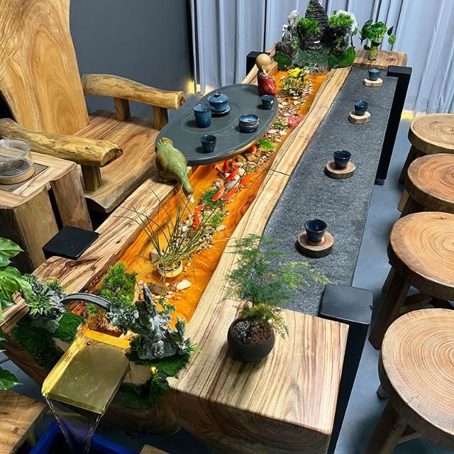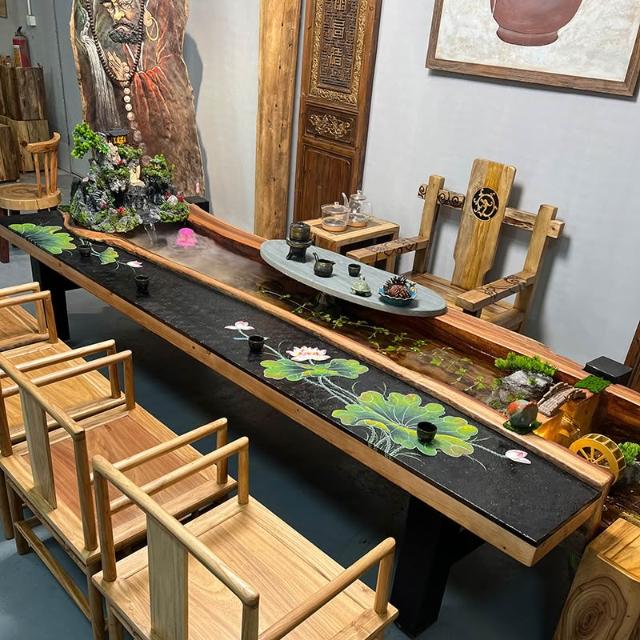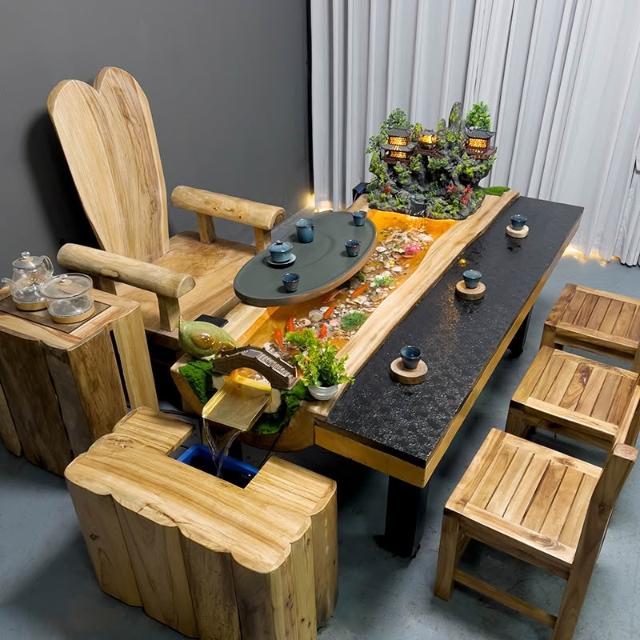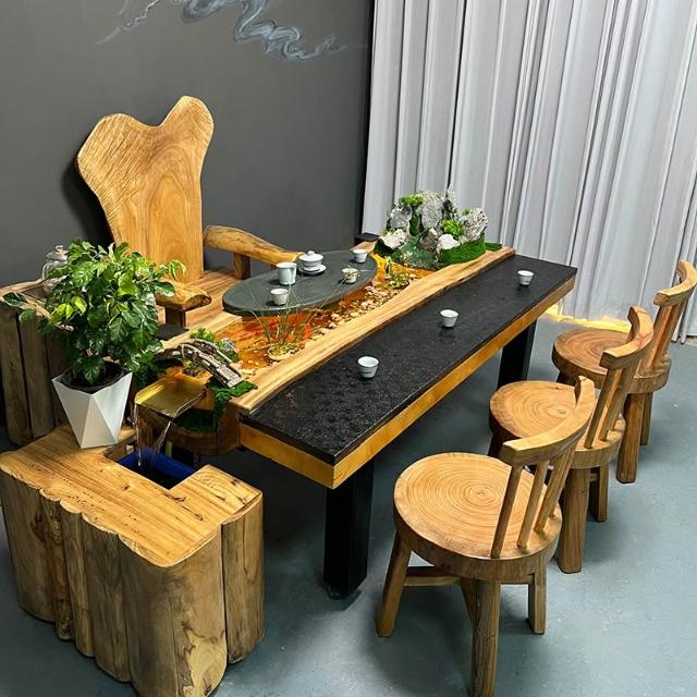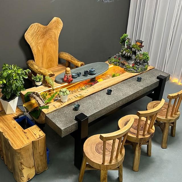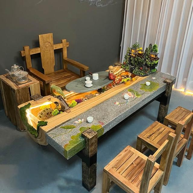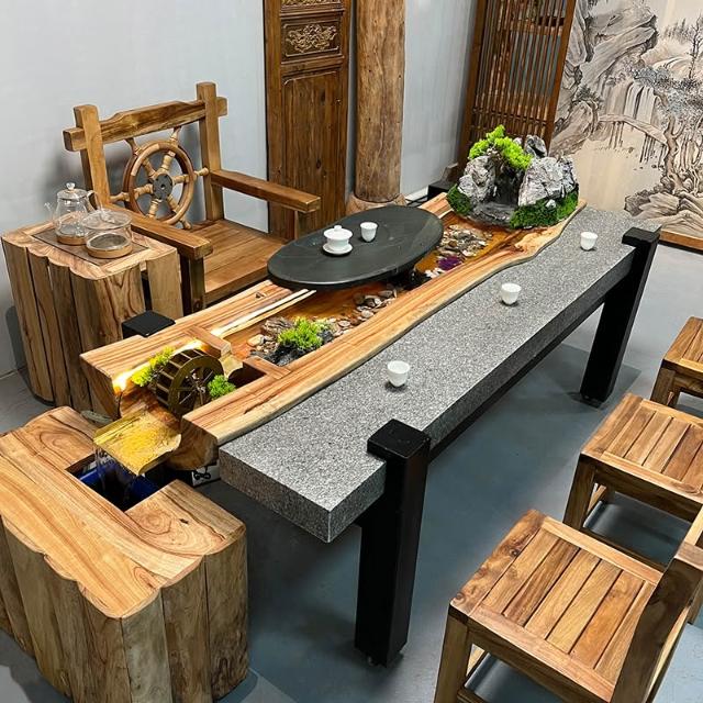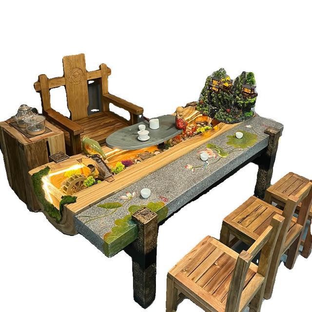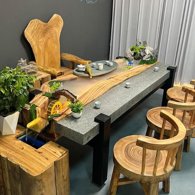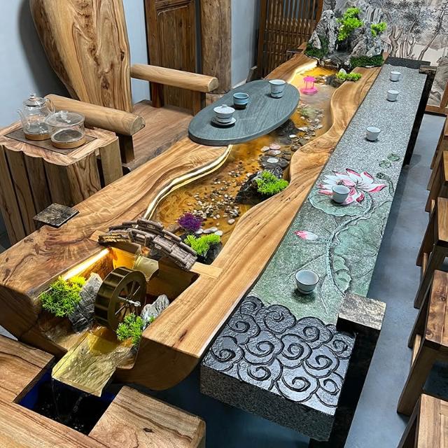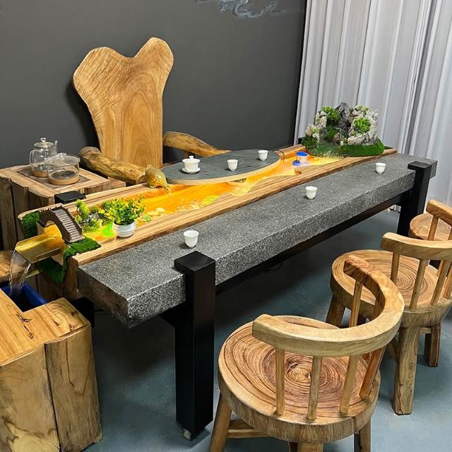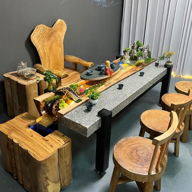中式流水茶桌景觀一體別墅庭院泡茶桌椅組合原木傢俱禪意實木茶臺