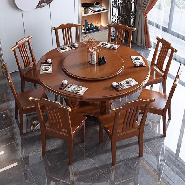 新中式實木餐桌椅組合家用簡約圓餐桌帶轉盤酒店圓形飯桌吃飯桌子