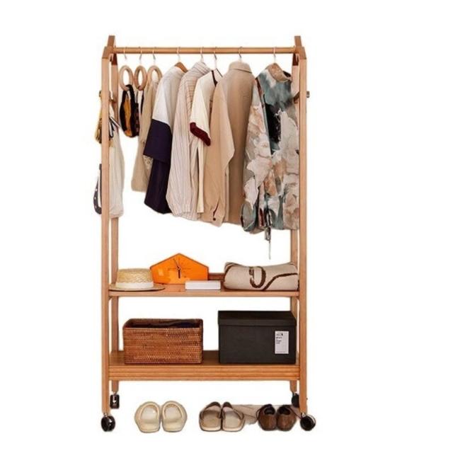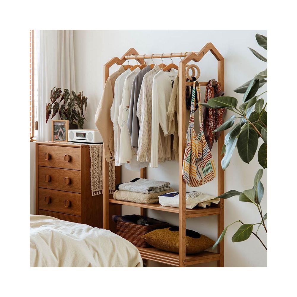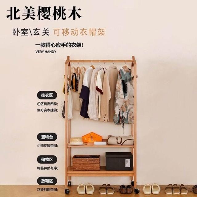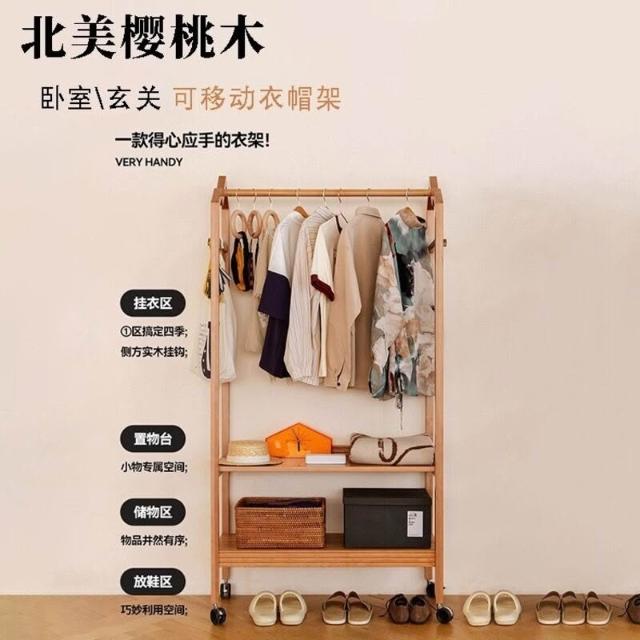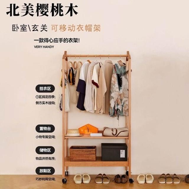 櫻桃木衣架落地帶輪掛衣架小戶型臥室收納開放式衣帽架輕奢衣帽架