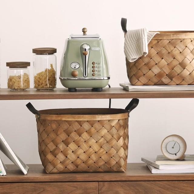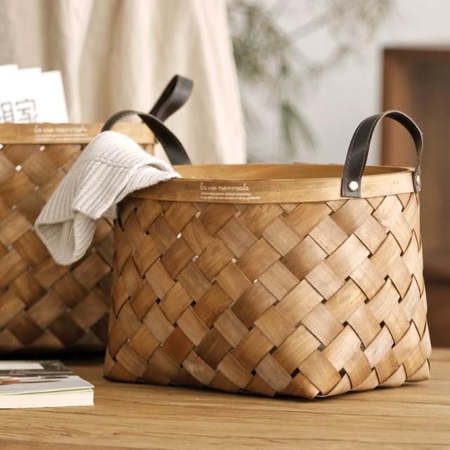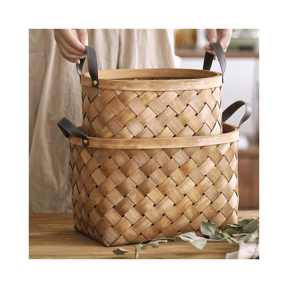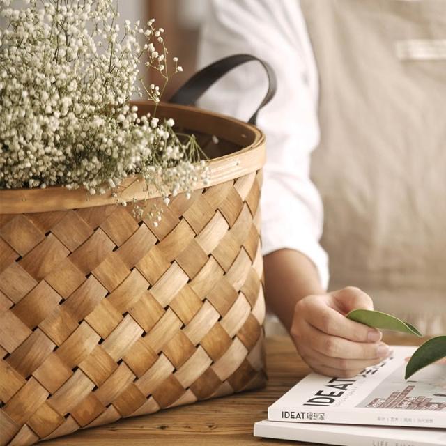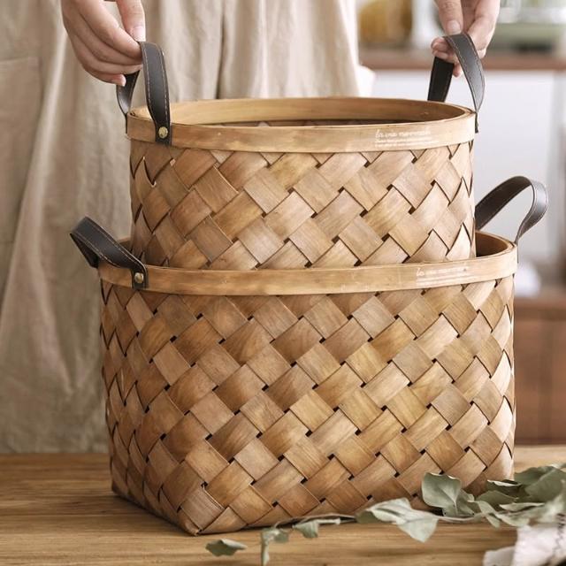 手工木片編織籃竹編竹籃子手提收納籃桌面收納筐菜籃購物籃野餐籃