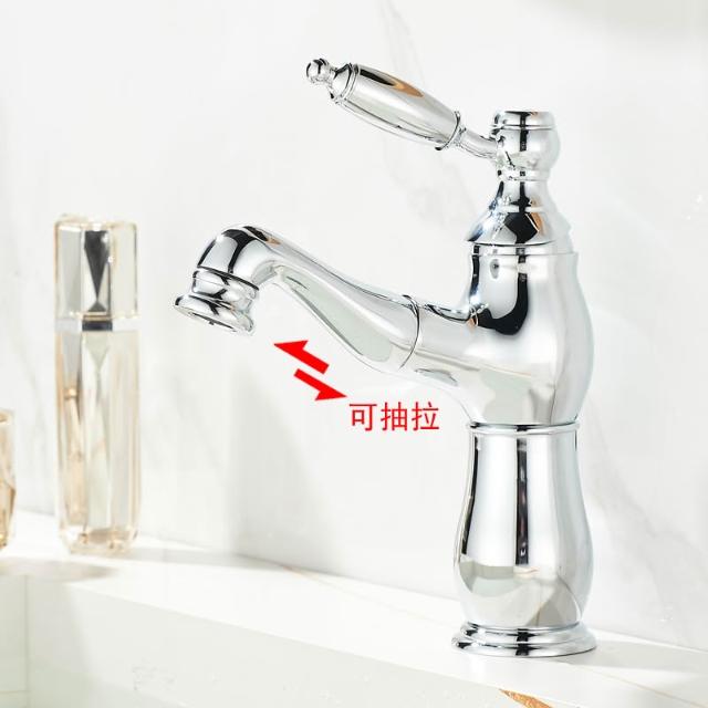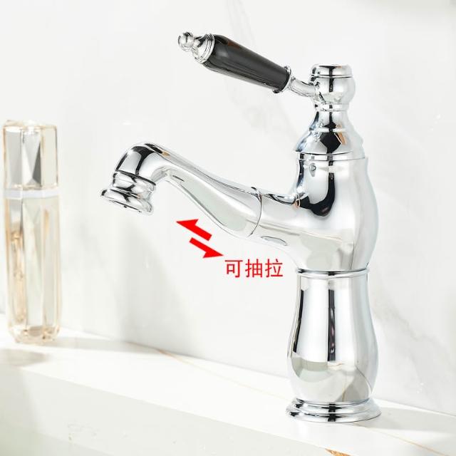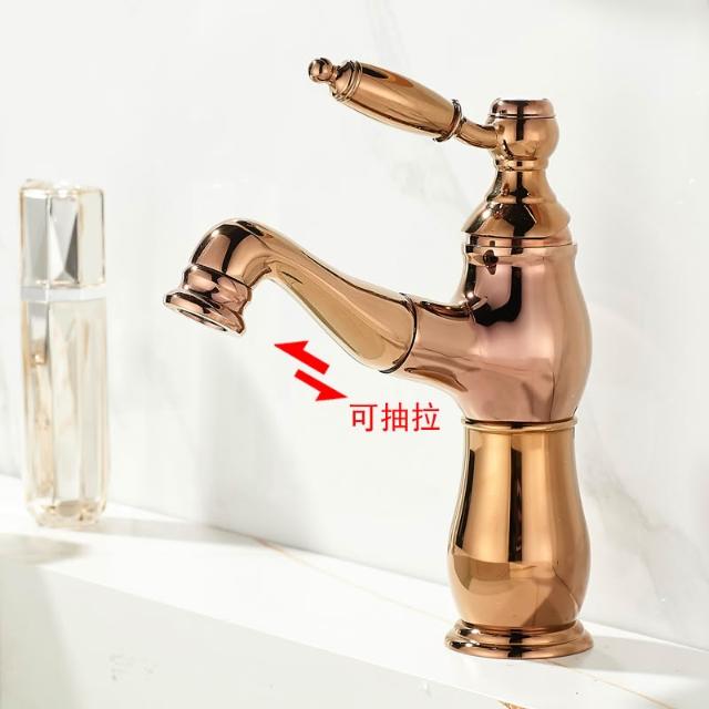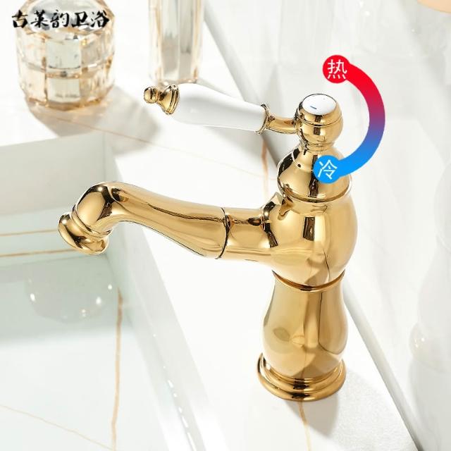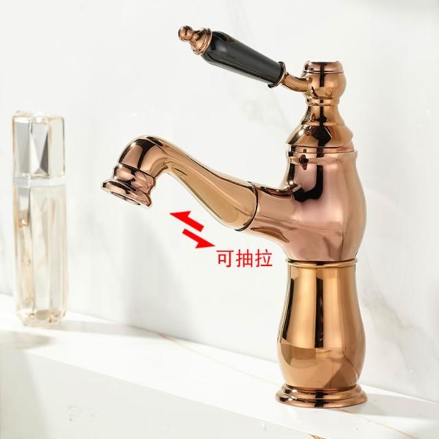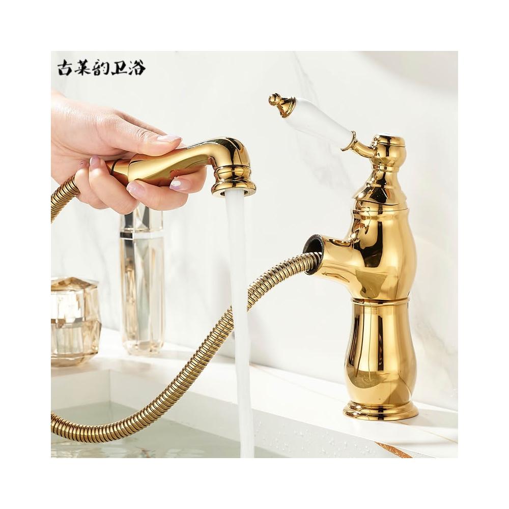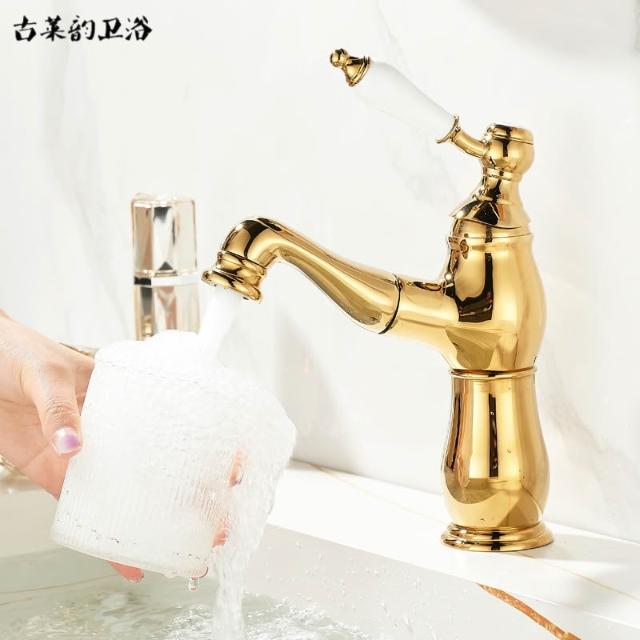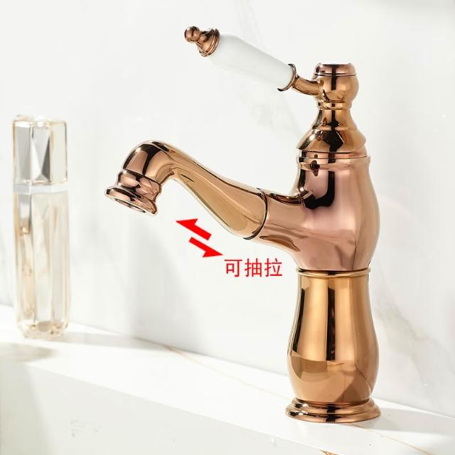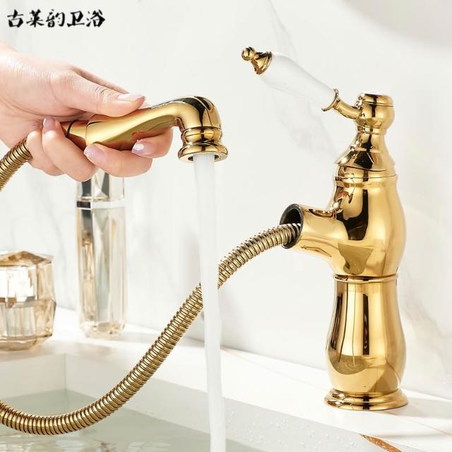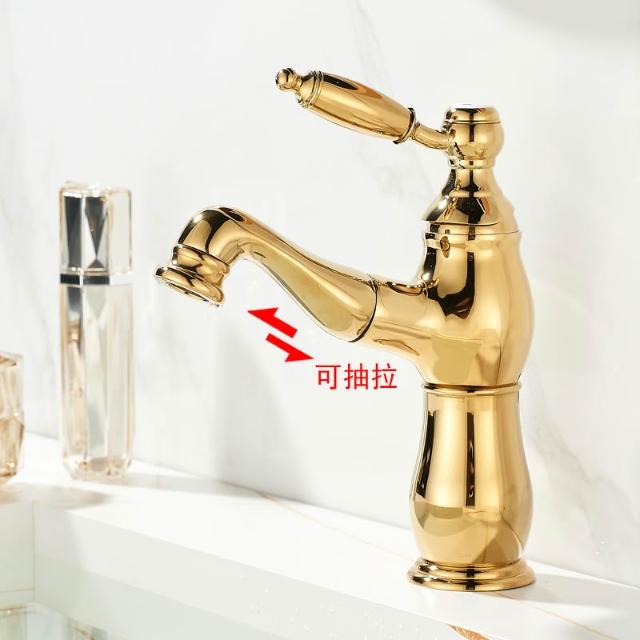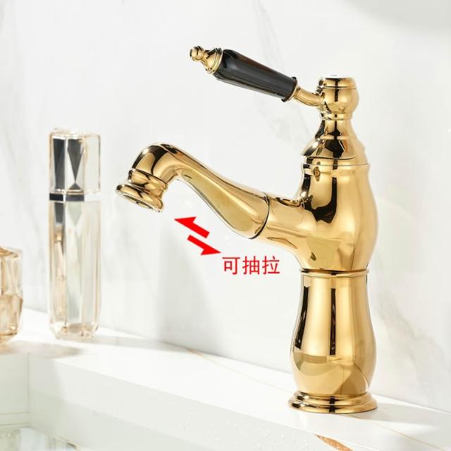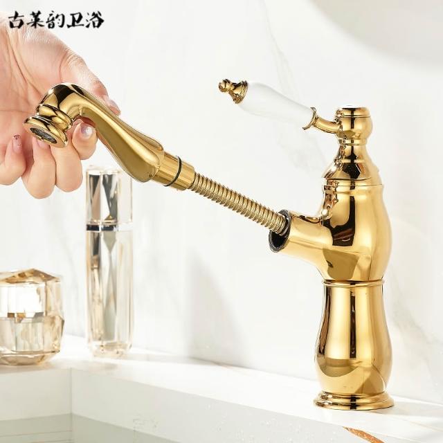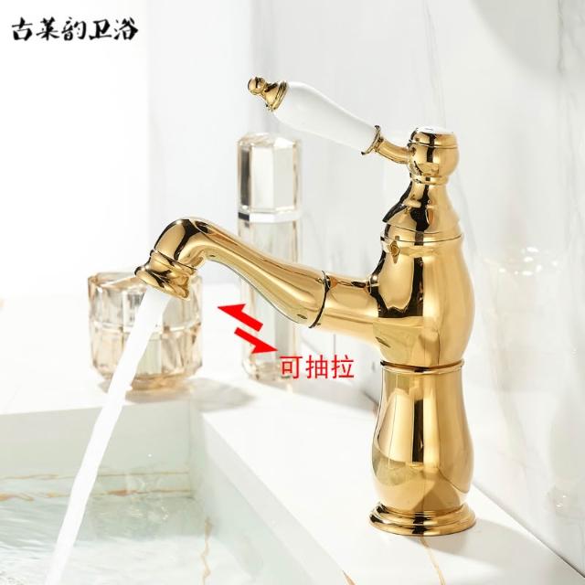 法式復古抽拉式水龍頭全銅面盆洗手龍頭浴室金色陶瓷把手冷熱水頭