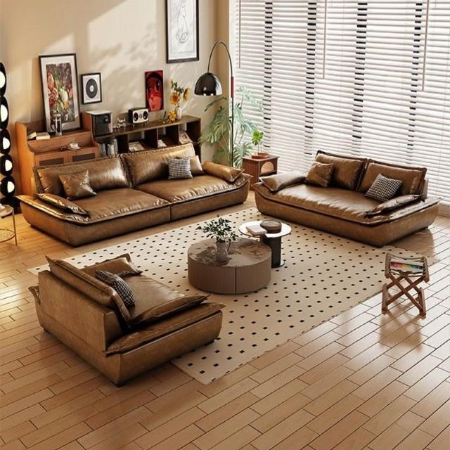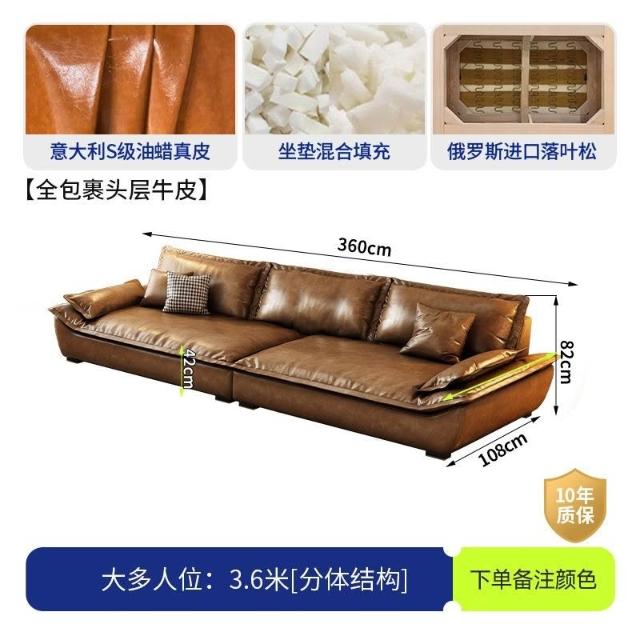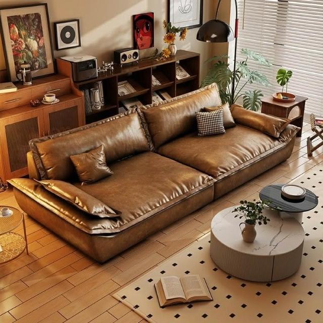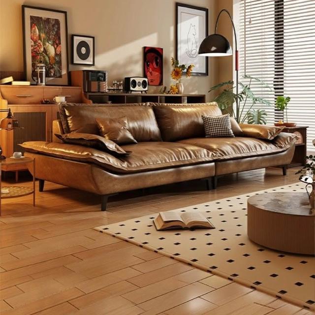 頤捨複古意式油蠟皮帆船皮沙髮古風客廳小戶型焦糖色真皮沙髮直排
