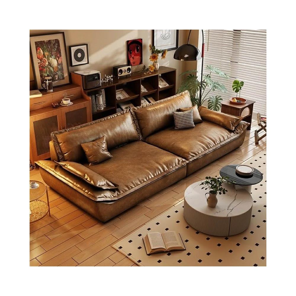 頤捨複古意式油蠟皮帆船皮沙髮古風客廳小戶型焦糖色真皮沙髮直排