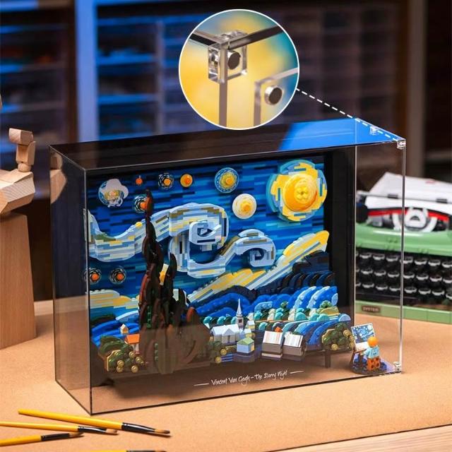 適用樂高21333梵高星月夜展示盒積木透明防塵罩星空燈飾掛牆