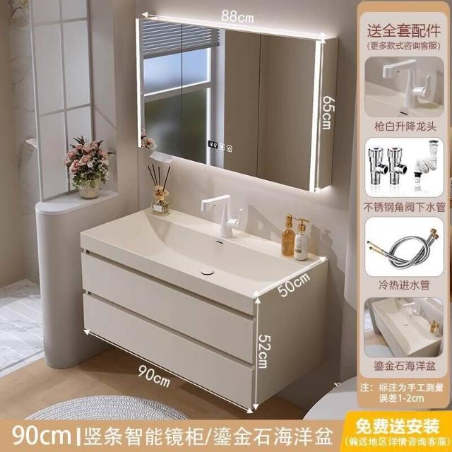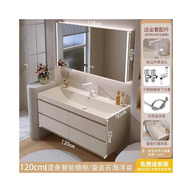 奶油風鎏金石一體盆浴室櫃組合衛生間洗漱臺洗臉盆櫃
