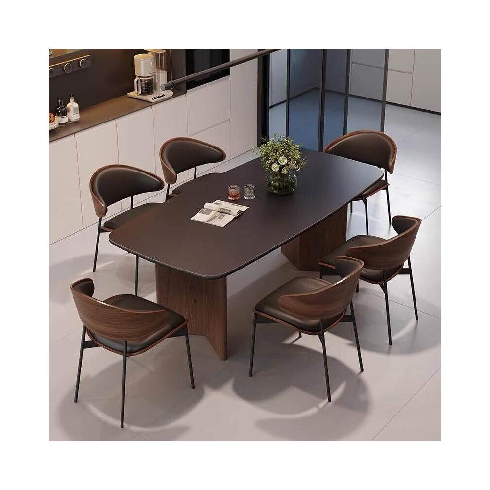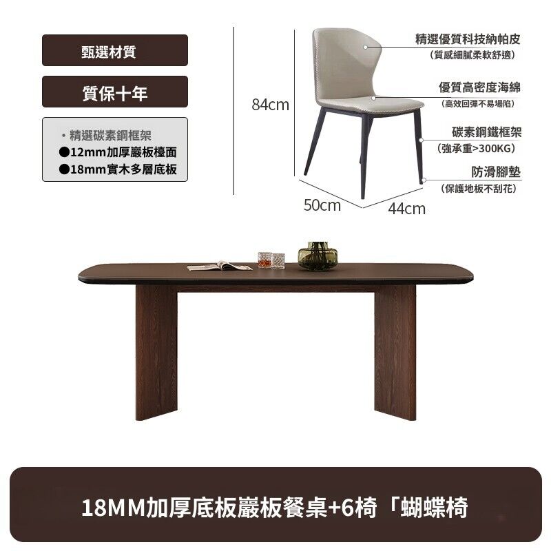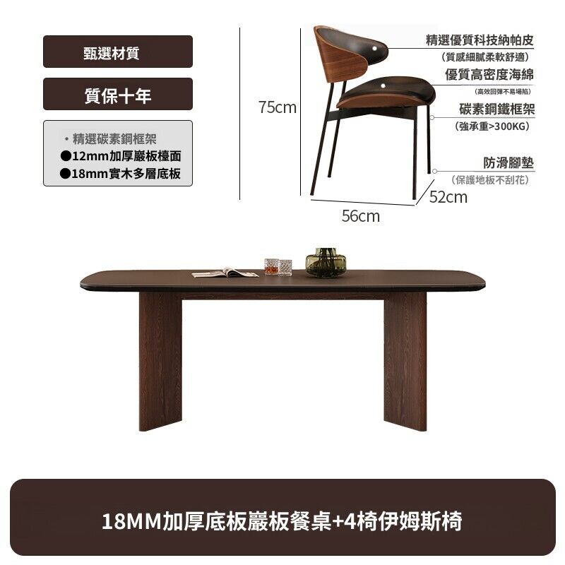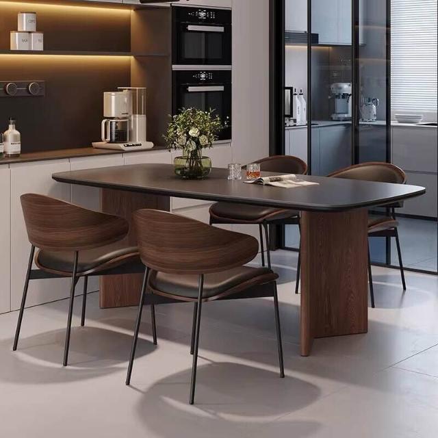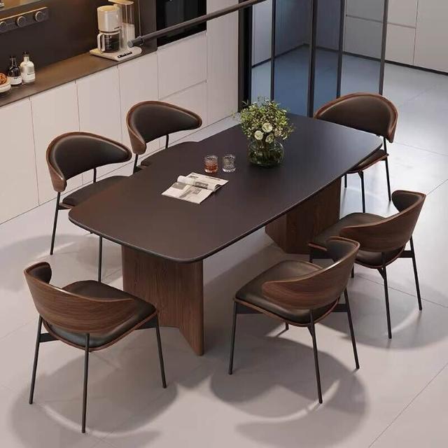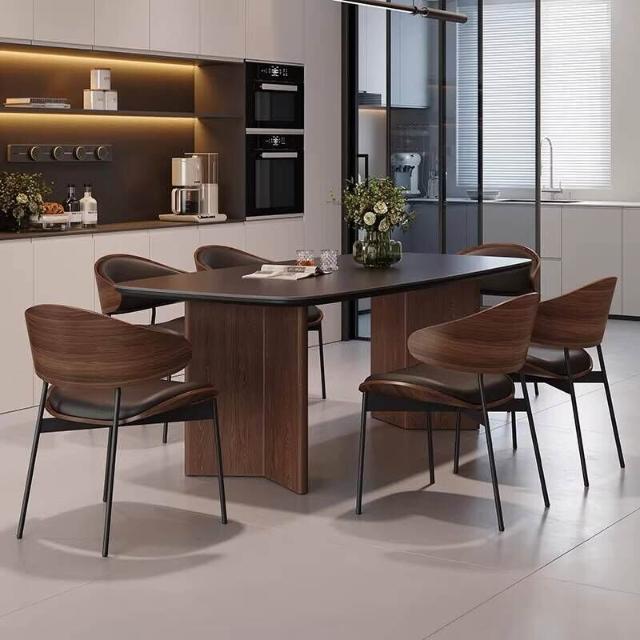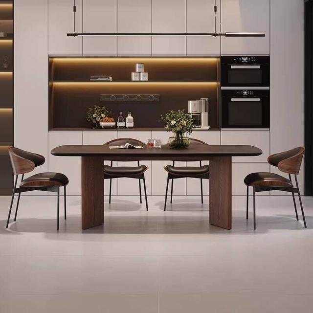 北歐實木巖板餐桌椅組合現代簡約全托底板胡桃色侘寂風飯桌桌子