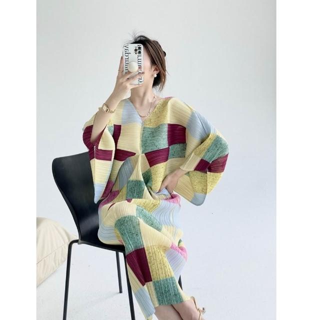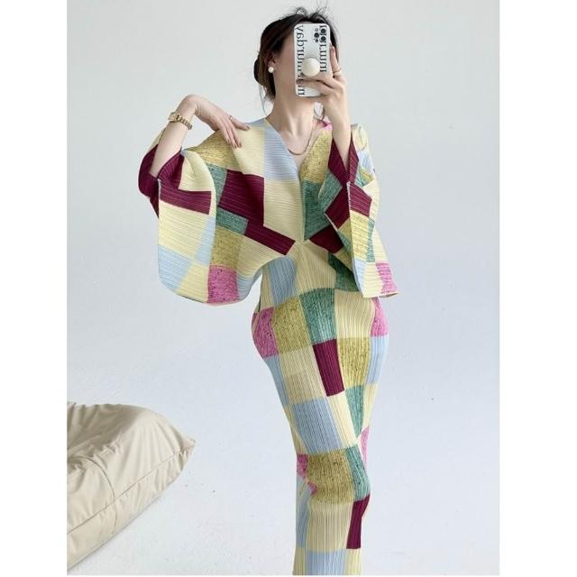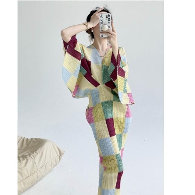 巴黎精品紐約精品 現貨+預購 三宅風皺褶衣服旗袍褶皺長裙連身裙褶衣高級摺衣彈力女裝顯瘦折衣大碼格子收腰a1jb39