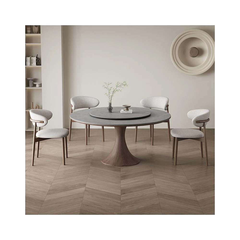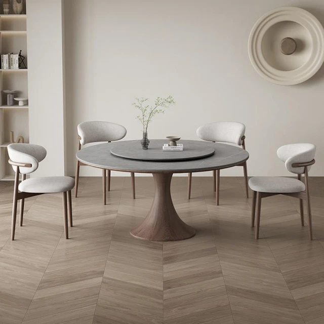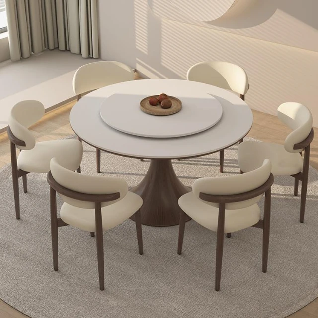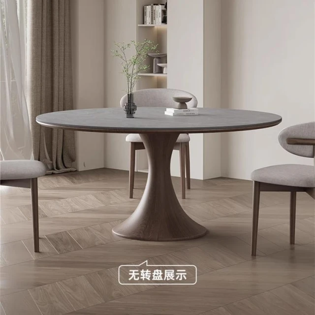 含稅/免運實木岩板圓形餐桌/帶轉盤餐桌椅組合/現代簡約胡桃色實木圓桌 CZ-25